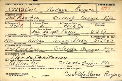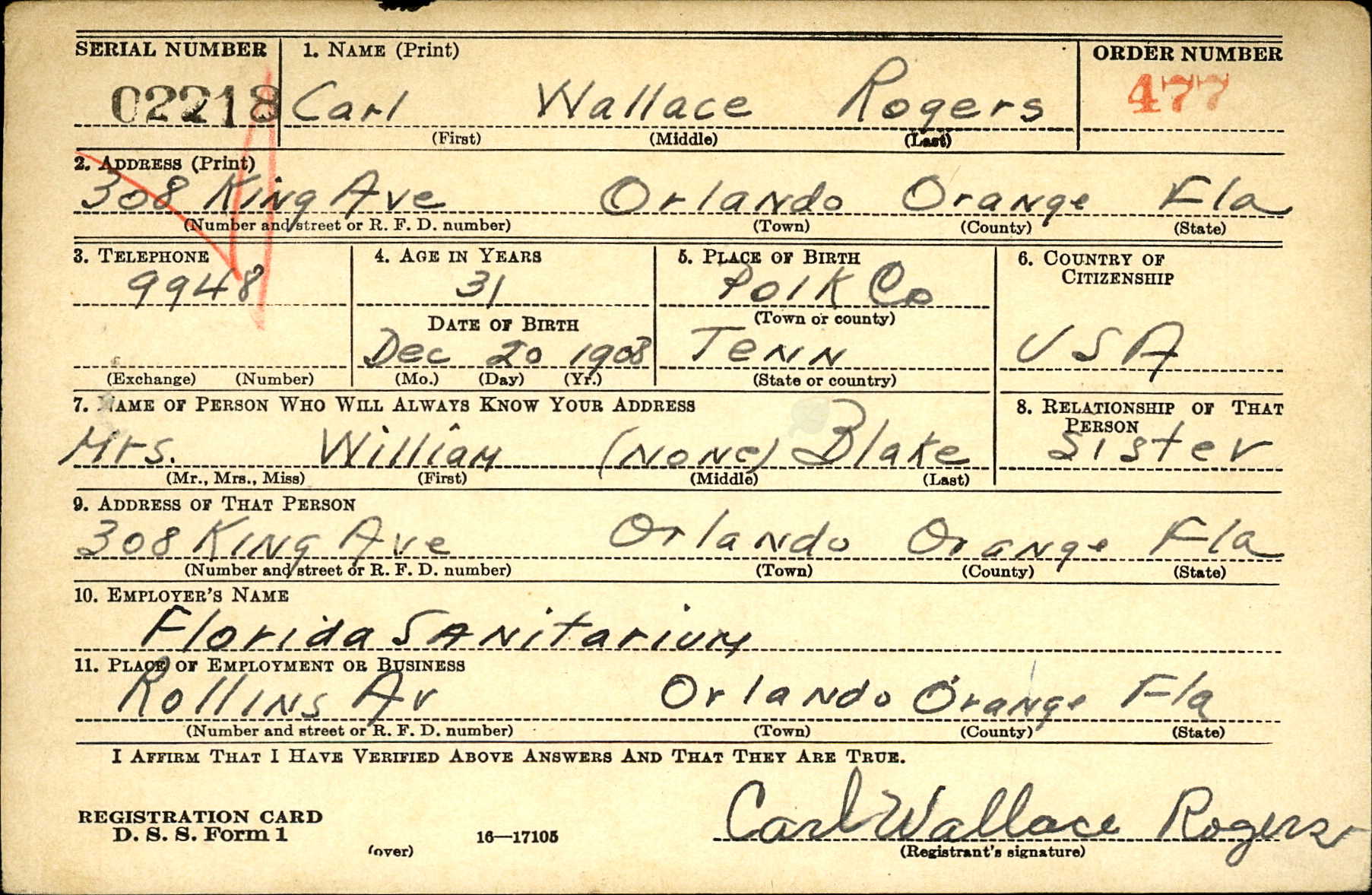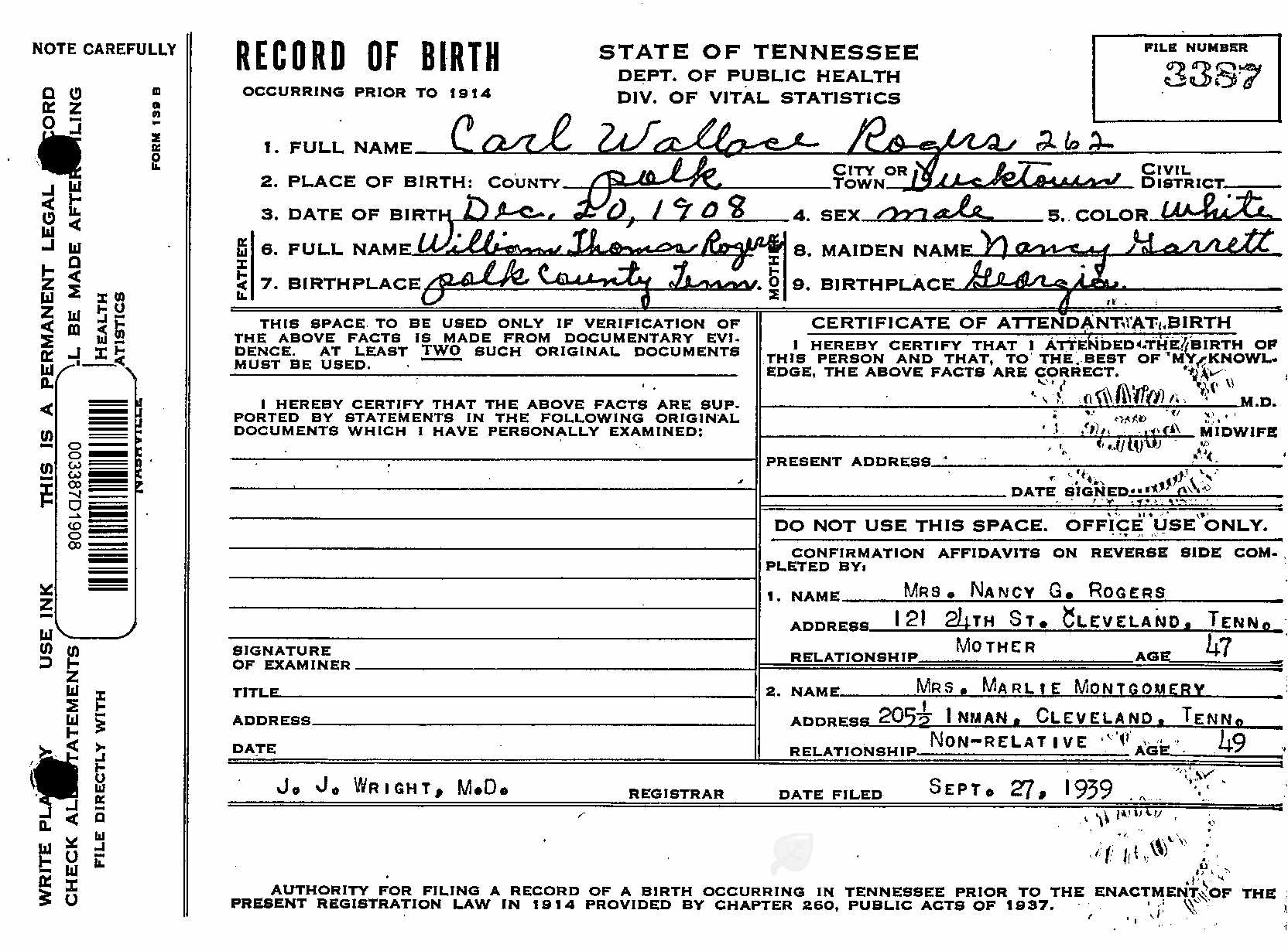 Carl Wallace Rogers was born on 20 December 1908 at Ducktown, Polk County, Tennessee to William Thomas Rogers and Nancy Garrett.