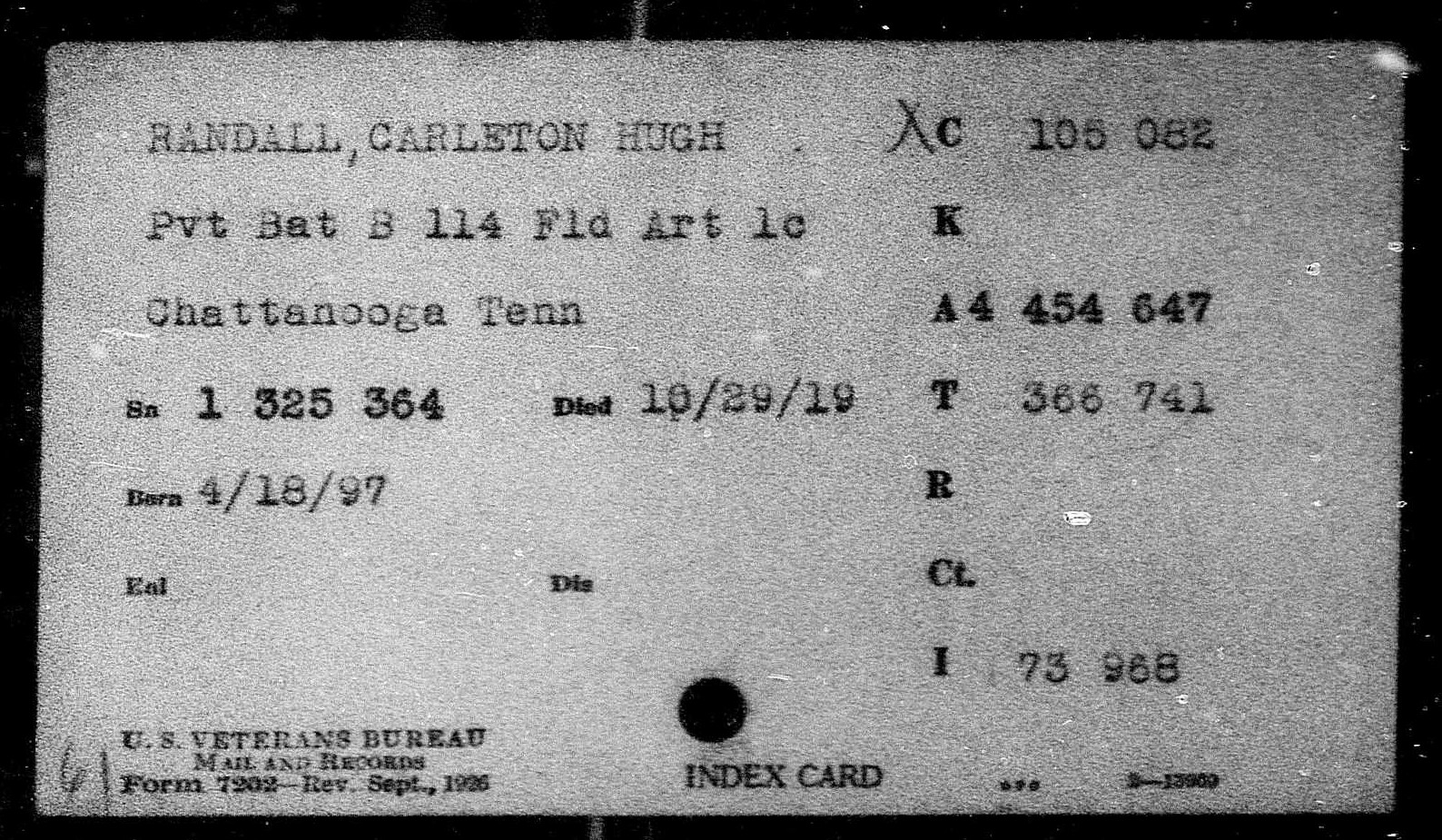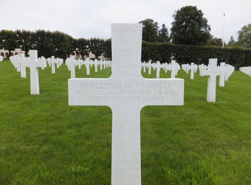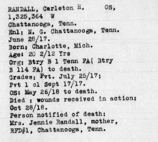 Carleton Hugh Randall was born in Charlotte, Michigan to Benjamin and Jennie Randall. He died of wounds received in action at the age of 21, and is buried plot G, row 25, Grave 19, Meuse-Argonne American Cemetery, Romagne, France. 144th Field Artillery Regiment, 30th Division AEF