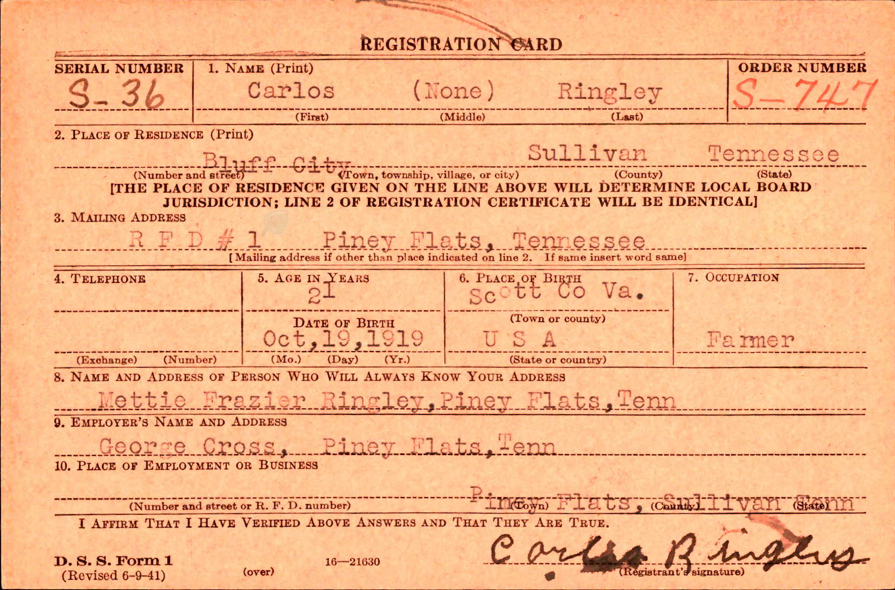Carlos Ringley was born 19 September 1919 in Virginia, the son of Nelson White Ringley and Martha “Mattie” H. Frazier.