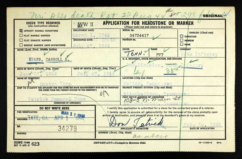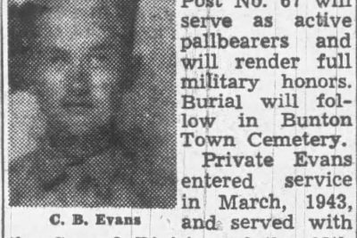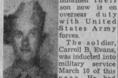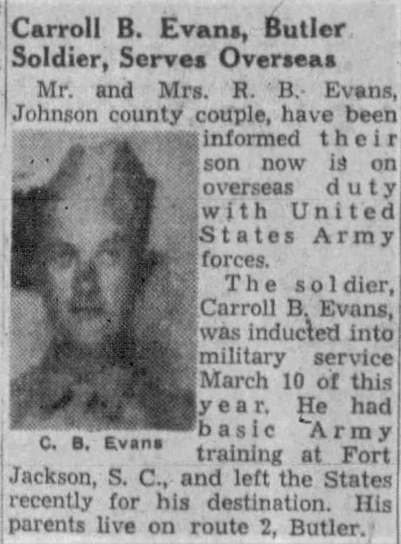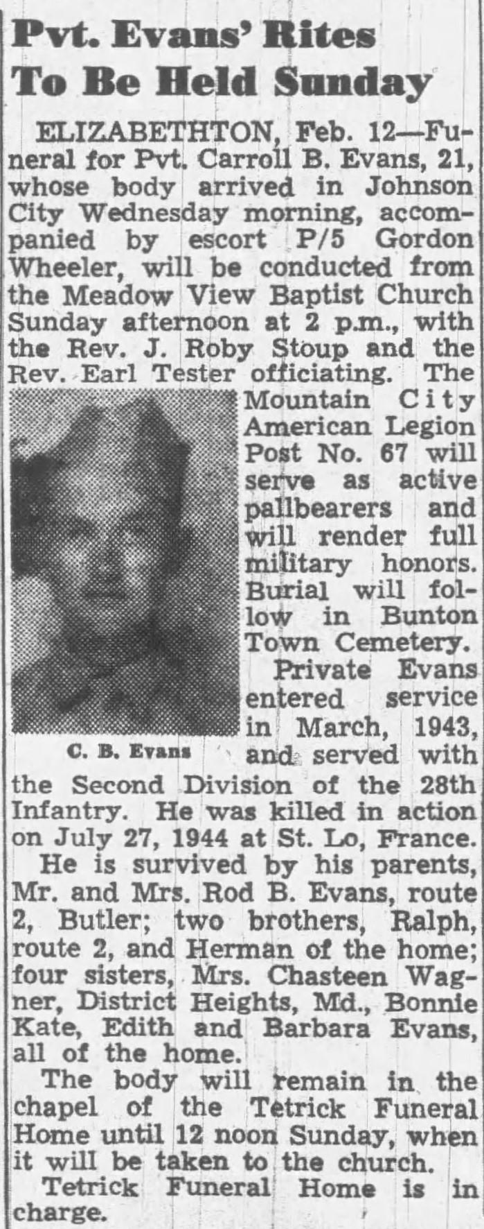 Funeral for Pvt. Carroll B. Evans, 21, whose body arrived in Johnson City, accompanied by escort P/5 Gordon Wheeler, will be conducted from the Meadow View Baptist Church.Private Evans entered service in March, 1943, and served with the Second Division of the 28th Infantry. He was killed in action on July 27, 1944 at St. Lo, France. He is survived by his parents, Mr. and Mrs. Rod B. Evans, rotue 2, Butler; two brothers, Ralph, Route 2 and Herman of the home; four sisters, Mrs. Chasteen Wagner, District Heights, Md., Bonnie Kate, Edith and Barbara Evans, all of the home.
