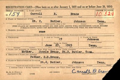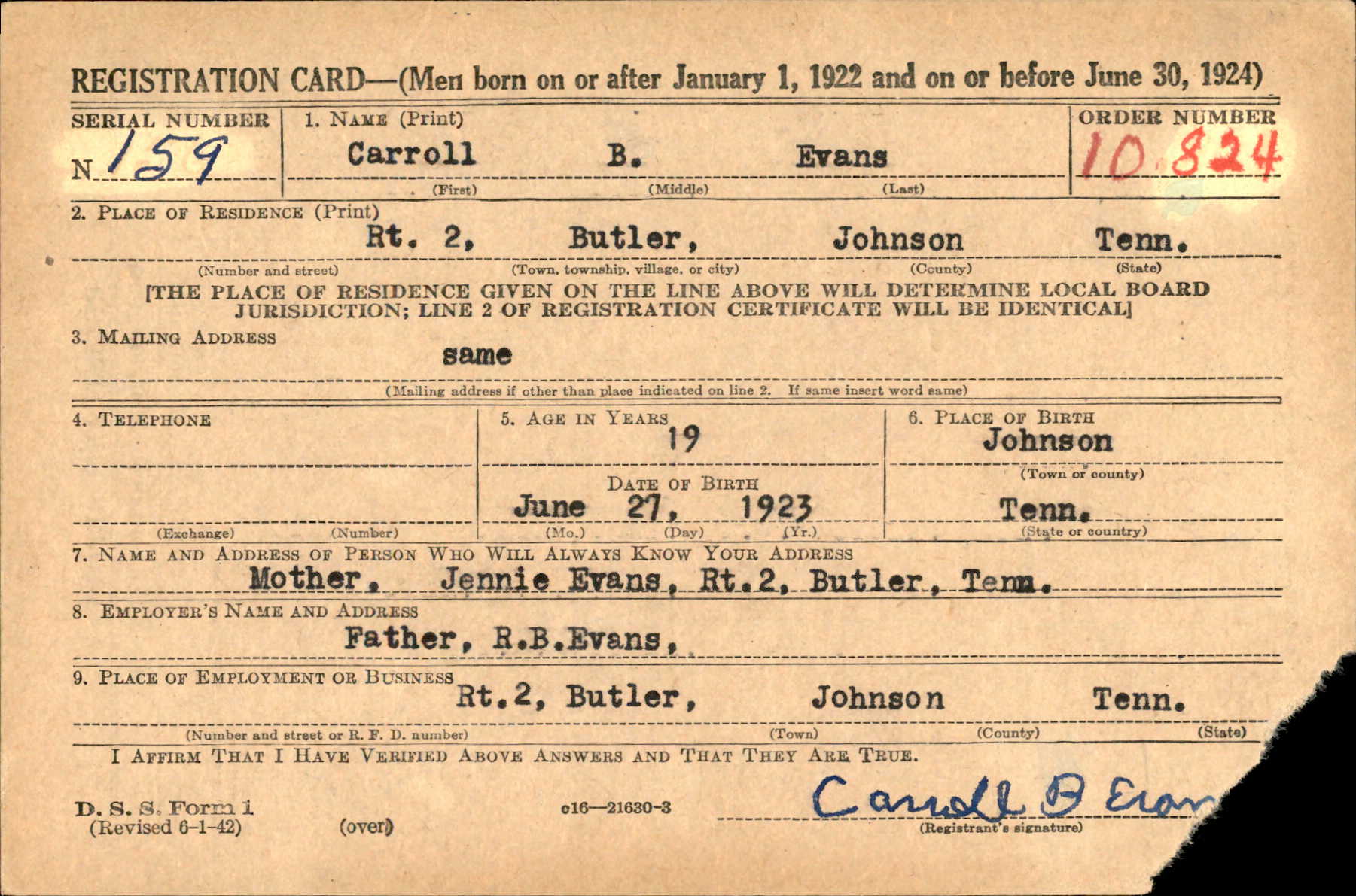 Carroll B. Evans was born on 27 June 1923, the son of Roddy B. Evans and Virginia “Jennie” Carene Green.
