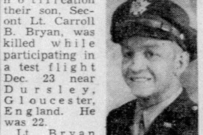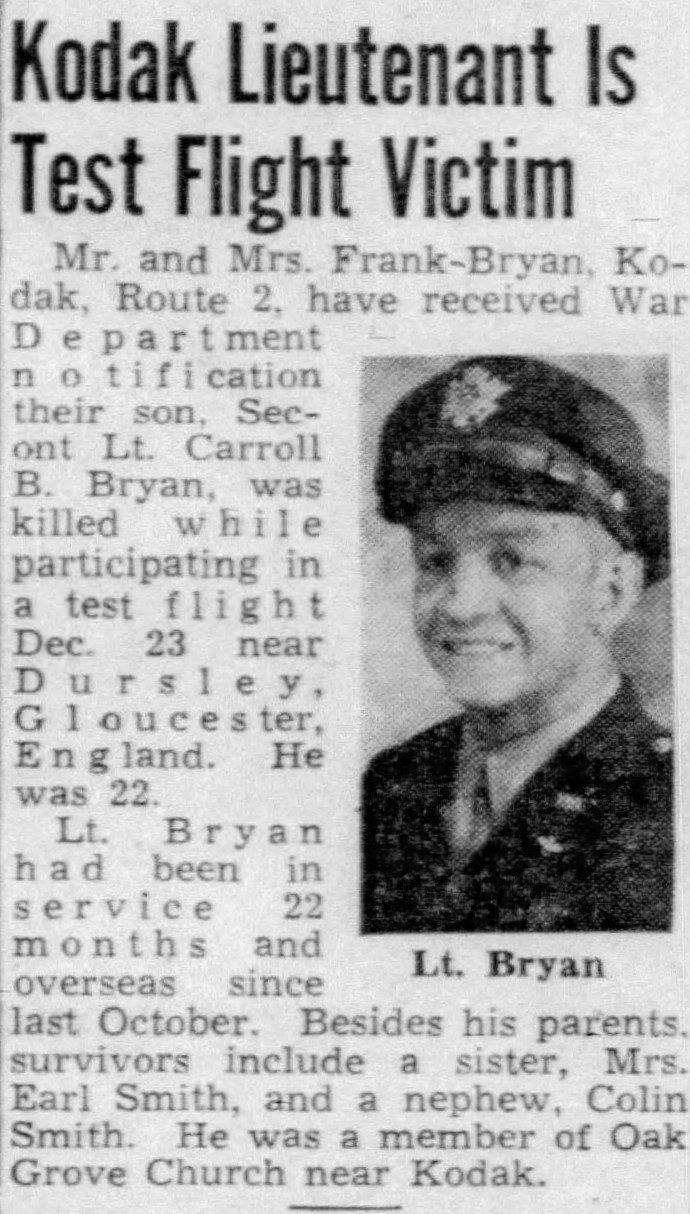Hi there could you help me at all? I am researching the death of Lt Caroll Baxter Bryan of Kodak. His aircraft crashed less than a mile away from where I am writing this mail in Gloucestershire, England on 23rd December 1944. I would like to try and find some living relatives but have drawn a blank so far. I hope to work with a team to erect a small memorial at the crash location on the 80th Anniversary next year. Would you be able to help at all or be involved, we will raise money for Veterans too. Best regards Andy Markham (amarkham7@aol.com).