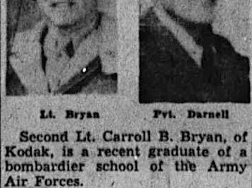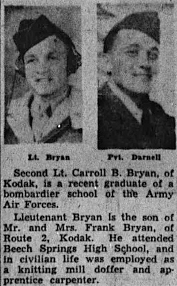 Second Lt. Carroll B. Bryan of Kodak, is a recent graduate of a bombardier school of the Army Air Forces. Lieutenant Bryan is the son of Mr. and Mrs. Frank Bryan, of Route 2, Kodak. He attended Beech Springs High School, and in civilian life was employed as a knitting mill doffer and apprentice carpenter.