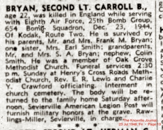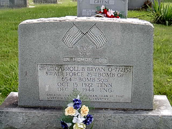 Carroll Baxter Bryan was born 15 October 1922 in Kodak, Sevier County, Tennessee to Frank Marion Bryan and Stella Rickard. He died non-battle 23 December 1944 in England.