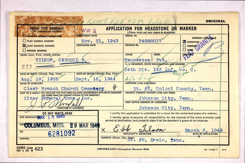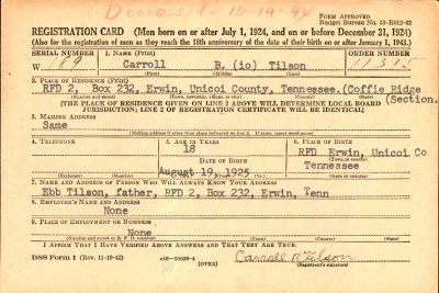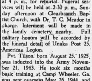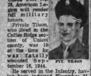 The body of Pvt. Carroll B. Tilson will arrive Saturday morning on the Tennessean in Johnson City, and will be brought to the home of his father, Ebb Tilson, R 2, Saturday afternoon at 4 p.m. for reburial. Funeral services will be held at Clearbranch Baptist Church. Interment will be made in the family cemetery nearby. Full military honors will be accorded by the funeral detail of Unaka Post 25, American Legion. Pvt. Tilson, born August 25, 1925, was inducted into the Army November 21, 1943. He took six months basic training at Camp Wheeler, Ga., was sent overseas May 26, 1944, and entering the Italian campaign was wounded September 14, 1944 and died two days later. He is the son of Mr. Ebb Tilson and the late Mrs. Tilson. Other survivors include three brothers, Dee, Ralph and Clifford Tilson; one sister, Mrs. Mattie Hensley, all of R. 2, Erwin.