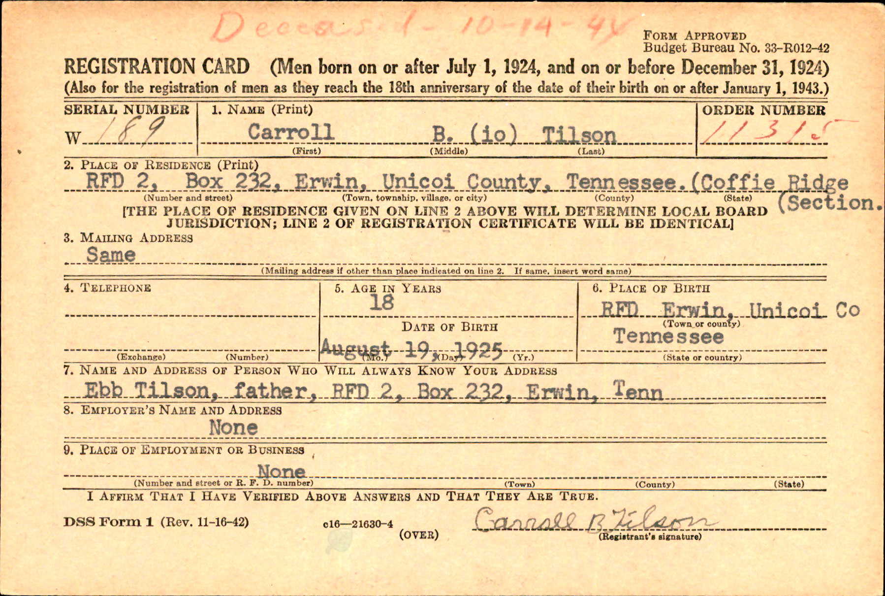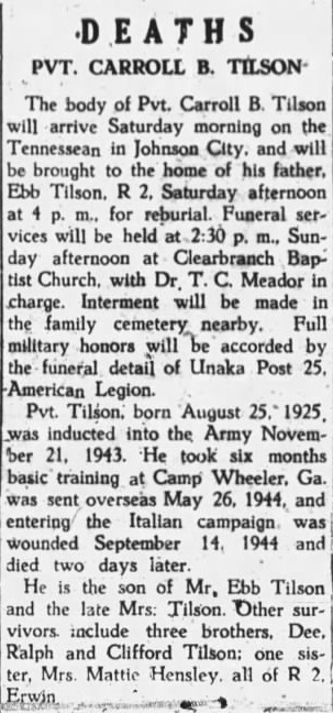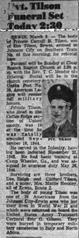 The body of Pvt. Carroll B. Tilson will arrive Saturday morning on the Tennessean in Johnson City, and will be brought to the home of his father, Ebb Tilson, R 2, Saturday afternoon at 4 p.m. for reburial. Funeral services will be held at Clearbranch Baptist Church. Interment will be made in the family cemetery nearby. Full military honors will be accorded by the funeral detail of Unaka Post 25, American Legion. Pvt. Tilson, born August 25, 1925, was inducted into the Army November 21, 1943. He took six months basic training at Camp Wheeler, Ga., was sent overseas May 26, 1944, and entering the Italian campaign was wounded September 14, 1944 and died two days later. He is the son of Mr. Ebb Tilson and the late Mrs. Tilson. Other survivors include three brothers, Dee, Ralph and Clifford Tilson; one sister, Mrs. Mattie Hensley, all of R. 2, Erwin.