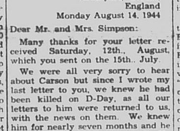 Many thanks for your letter received Saturday 12th August, which you sent on the 15th July. We were all very sorry to hear about Carson but since I wrote my last letter to you, we knew he had been killed on D-Day, as all our letters to him were returned to us, with the news on them. We knew him for nearly seven months and he was loved and respected by all. He had been coming to our house nearly every day in that time so you can guess how we missed him and the news of his death upset us terribly. So we know how your family must have been.