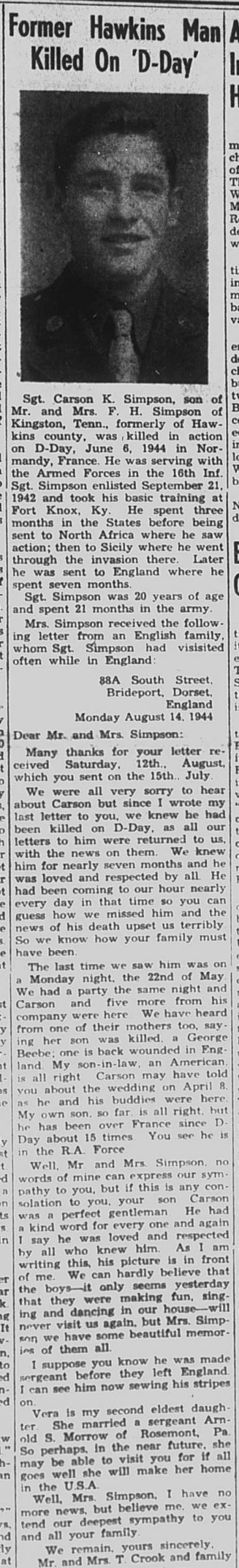 Sgt. Carson K. Simpson, son of Mr. and Mrs. F.H. Simpson of Kingston, Tenn, formerly of Hawkins county, was killed in action on D-Day, June 6, 1944 in Normandy, France. He was serving with the Armed Forces in the 16th Inf. Sgt. Simpson enlisted September 21, 1942 and took his basic training at Fort Knox, Ky. He spent three months in the States before being sent to North Africa where he saw action; then to Sicily where he went through the invasion there. Later he was sent to England where he spent seven months. Sgt. Simpson was 20 years of age and spent 21 months in the army.