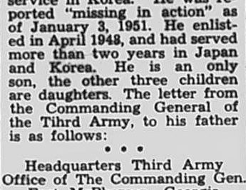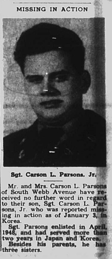 Mr. and Mrs. Carson L. Parsons of South Webb Avenue have received no further word in regard to their son, Sgt. Carson L. Parsons Jr. who was reported missing in action as of January 3, in Korea.