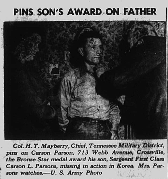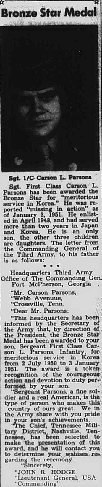 Sgt. First Class Carson L. Parsons has been awarded the Bronze Star for “meritorious service in Korea.” He was reported “Missing in action’ as of January 3, 1951. He enlisted in April 1948, and had served more than two years in Japan and Korea. He is an only son, the other three children are daughters.
