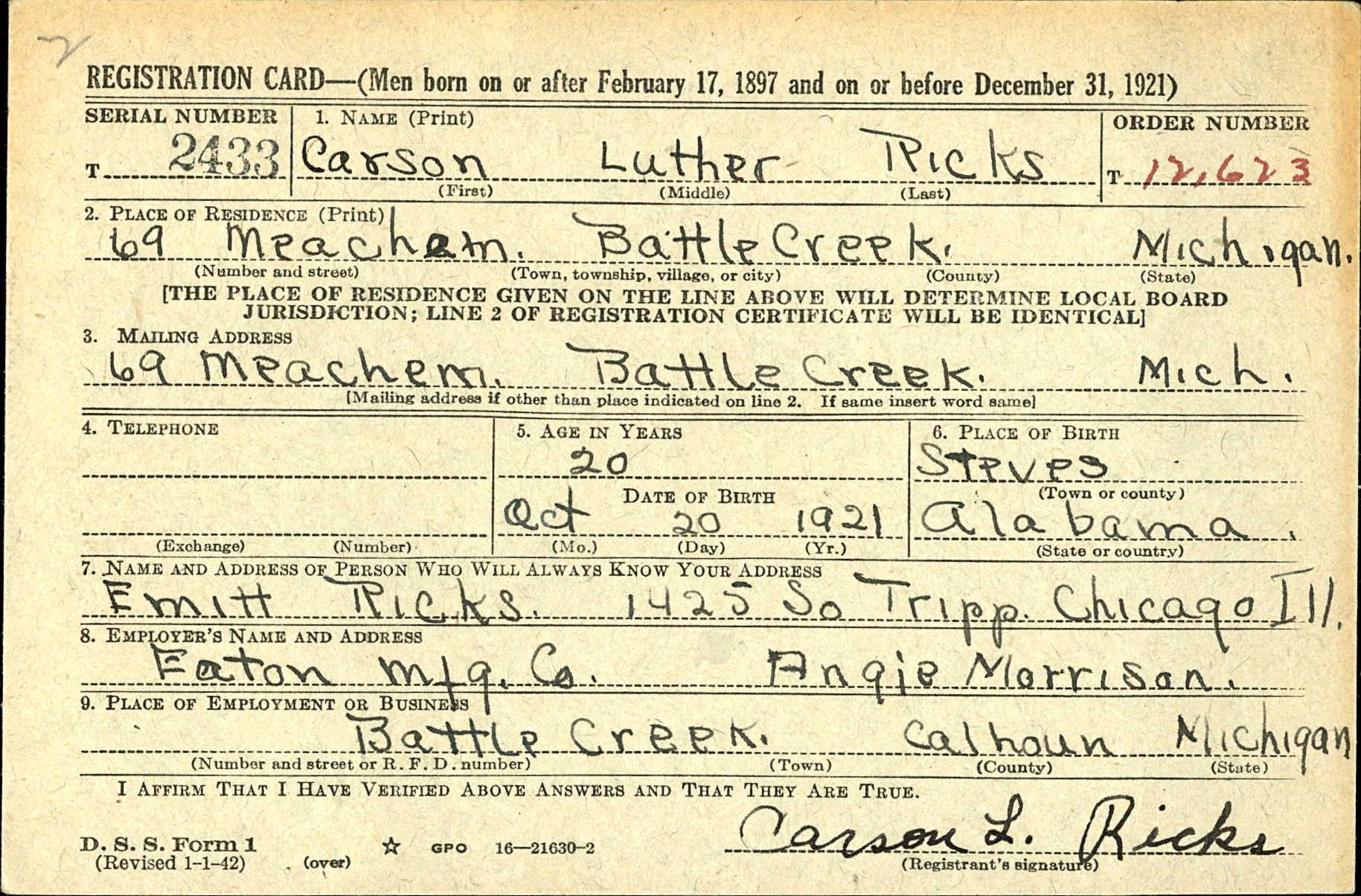 Carson Luther Ricks was born around 1921 in Alabama. He was the son of Isaac Walter Ricks and Maggie Louella Shelton.