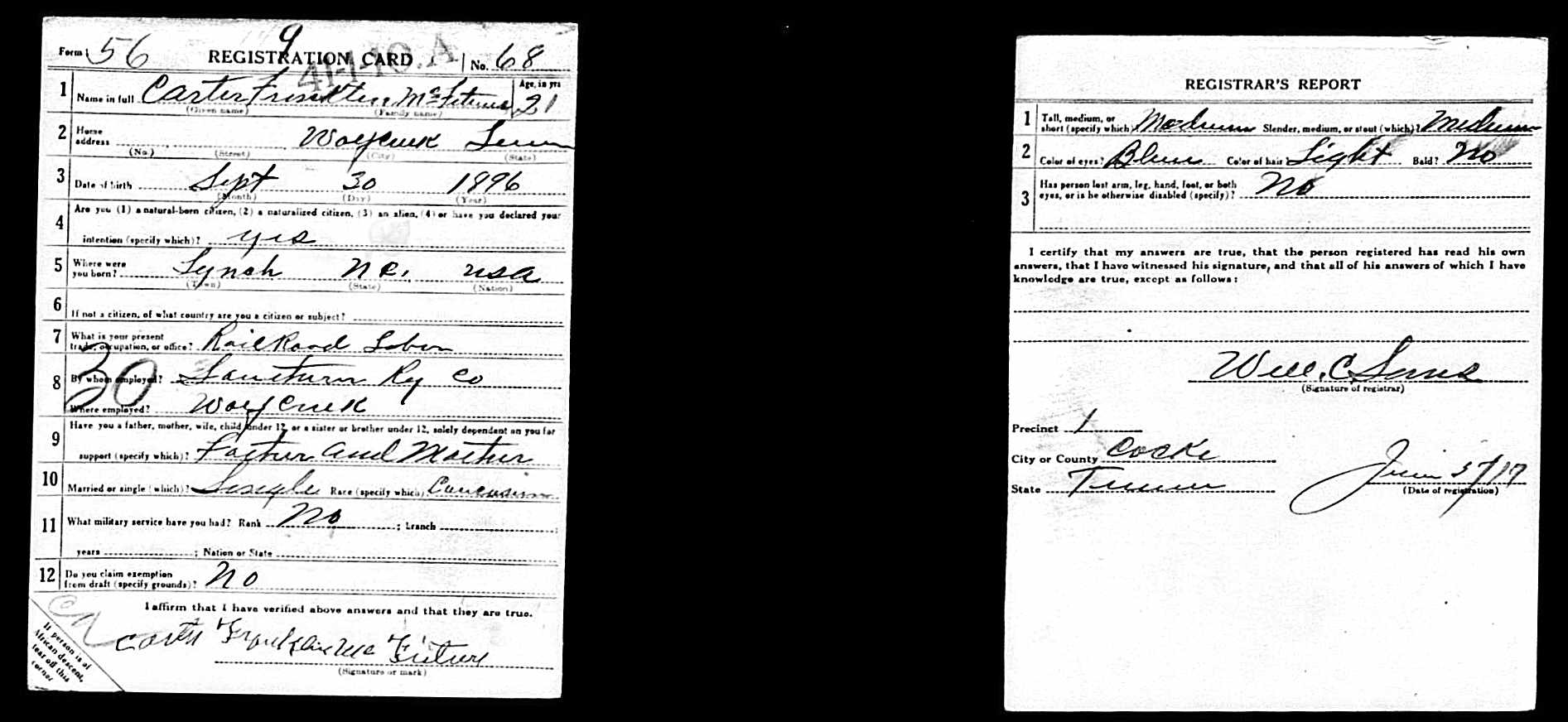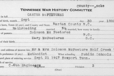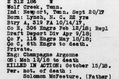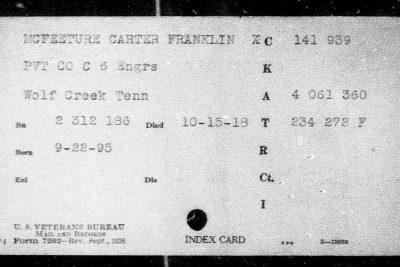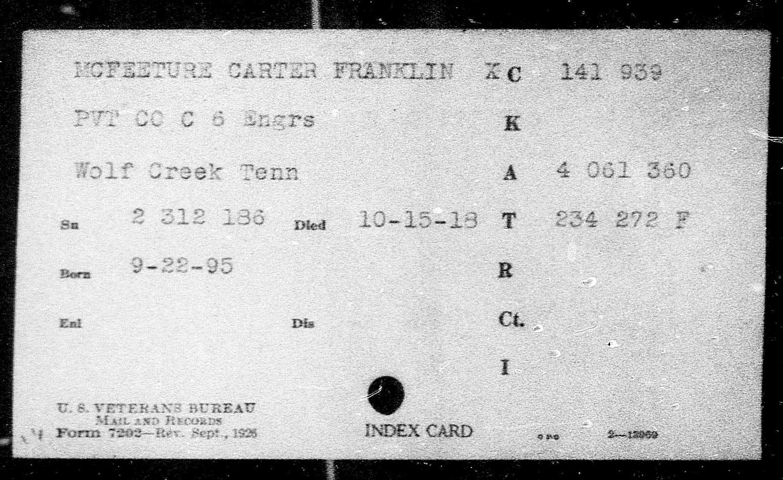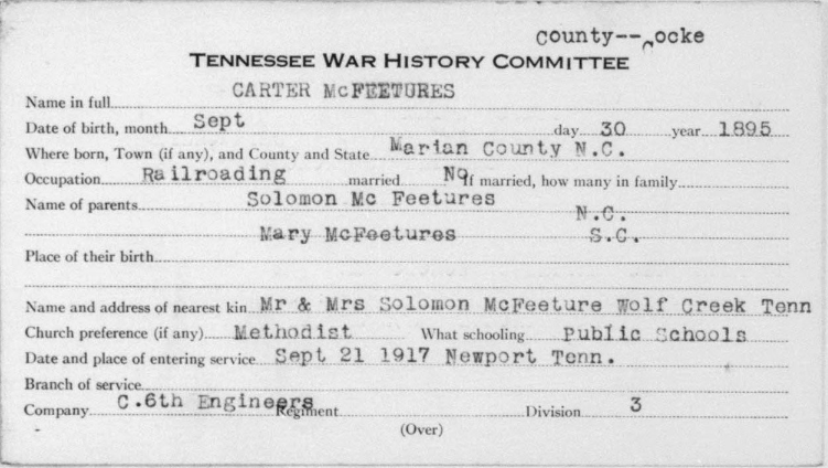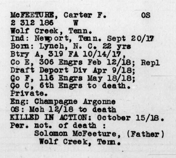 Carter Franklin McFeatures, spelled McFeeture in state records, was born in Lynch, North Carolina. He was killed in action in France at the age of 22. Son of Solomon C. McFeatures and Mary Shetley.