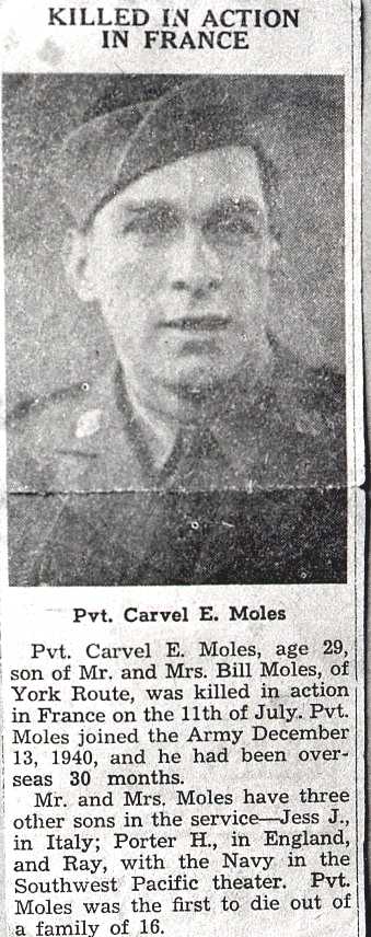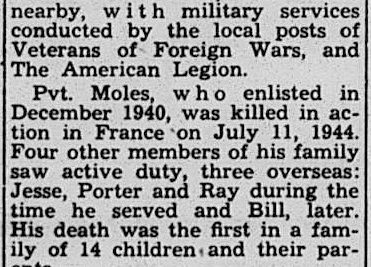 Private Moles enlisted for service in World War II on December 13, 1940, in Fort Thomas in Newport, Kentucky. He served in the European Theater of War. On July 11, 1944, he died at the age of 29 from wounds he received in the Invasion of Normandy. Private Moles was the first to die out of a family of 16. At the time of his death, his brother Jess J. Moles was serving Italy, his brother Porter H. Moles was serving in England, and his brother Ray Moles was serving with the Navy in the Southwest Pacific.
