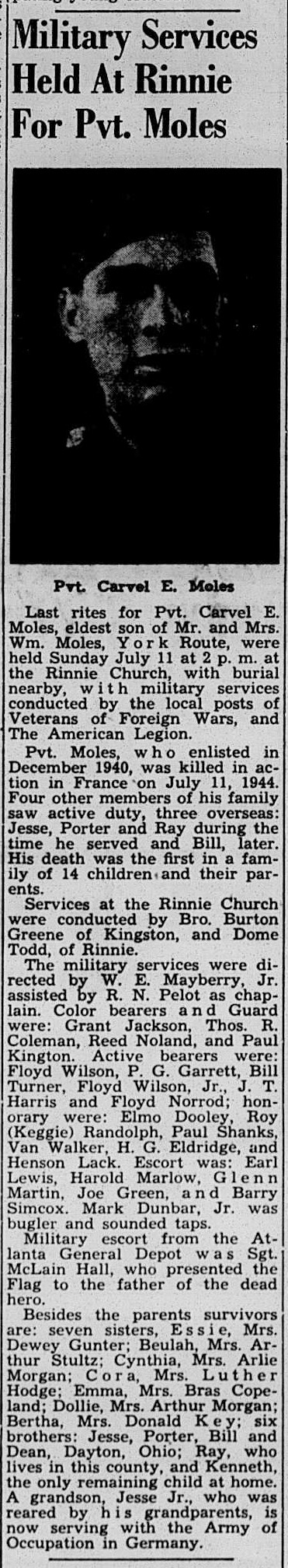 Private Moles enlisted for service in World War II on December 13, 1940, in Fort Thomas in Newport, Kentucky. He served in the European Theater of War. On July 11, 1944, he died at the age of 29 from wounds he received in the Invasion of Normandy. Private Moles was the first to die out of a family of 16. At the time of his death, his brother Jess J. Moles was serving Italy, his brother Porter H. Moles was serving in England, and his brother Ray Moles was serving with the Navy in the Southwest Pacific.