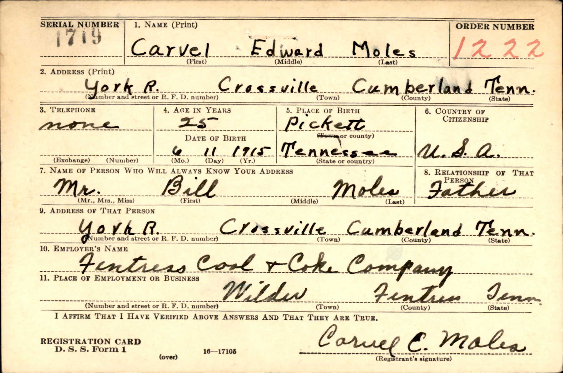 Private Carvel Edward Moles was born on June 11, 1915 in Gunter Town, Tennessee. He was the son of William Wilson and Della Katherine Moles. He had several siblings: Ethie Lee Moles, Beulah Mae Moles, Jess James Moles, Corz Izora Mole, Cynthia Jane Moles, Porter Harson Moles, Dallie Moles, Emma Marie Moles, Roy Luther Moles, Bertha G. Moles, Billie Eugene Moles, and Harold Dean Moles, and Kenneth Jimmy Moles. He was raised in Crossville, Tennesse.