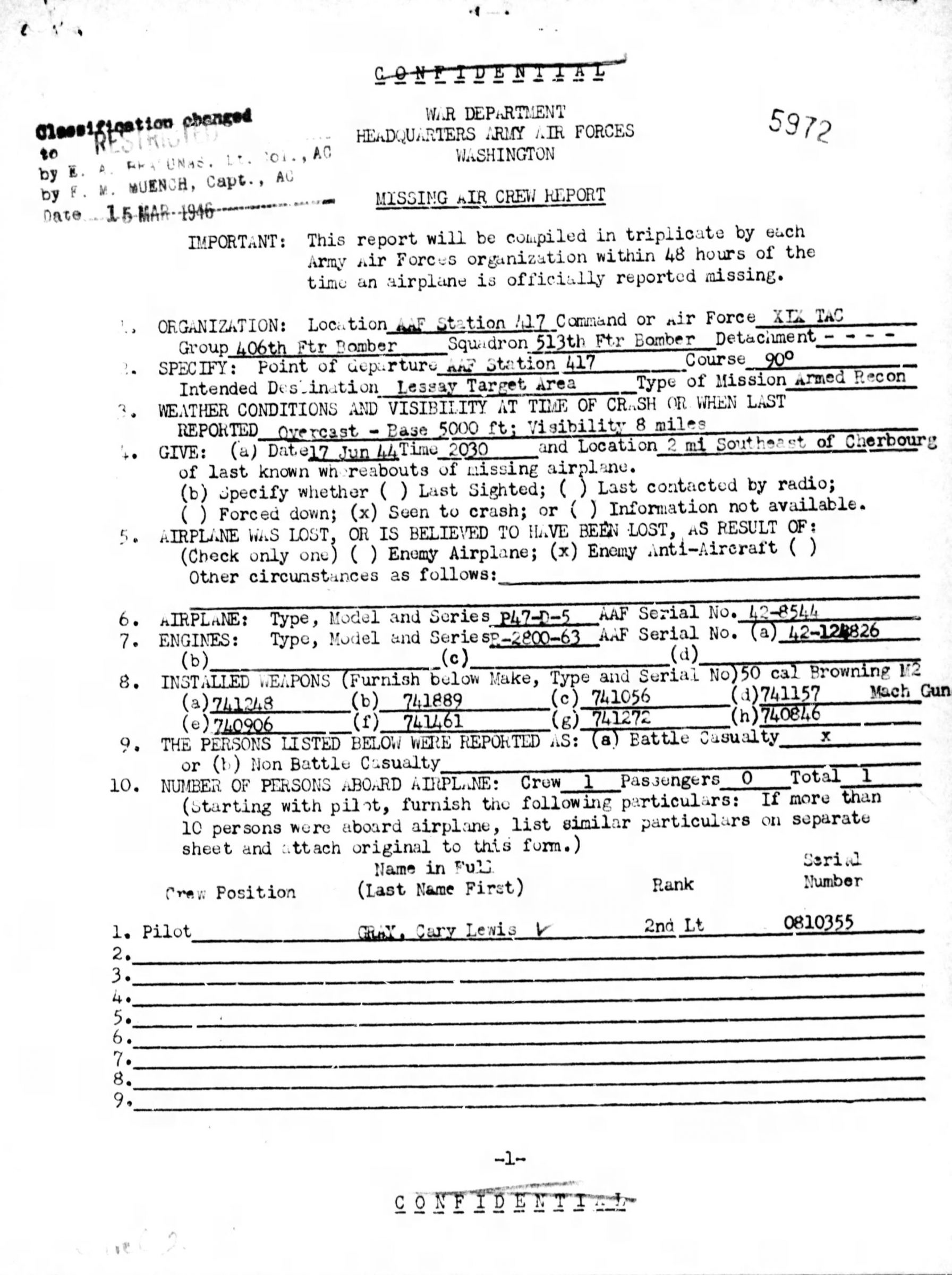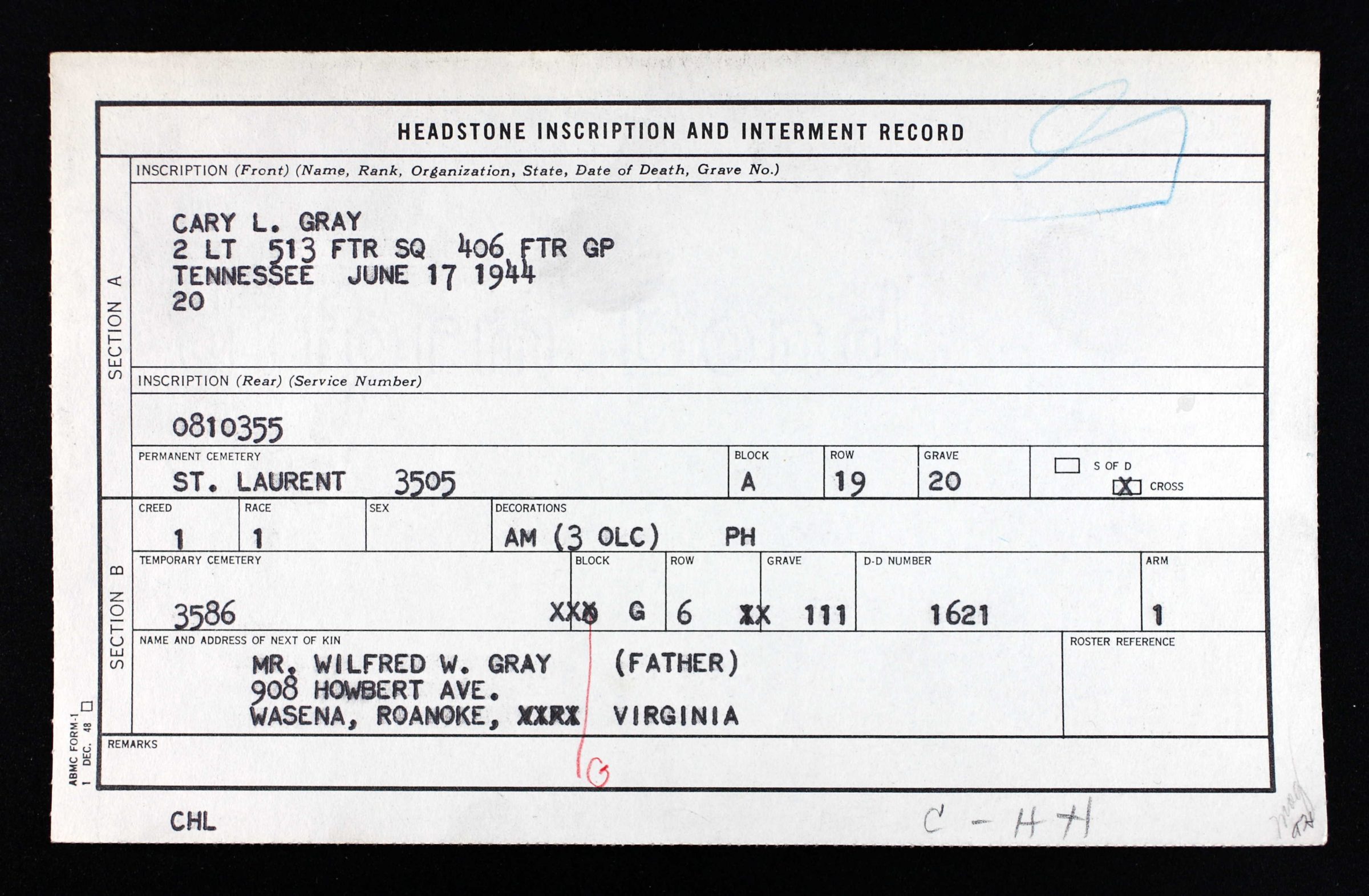 2nd Lieutenant Cary Lewis Gray #O-810355 US Army Air Forces was assigned to the 513th Fighter Squadron, 406th Fighter Group of the 9th Air Force. He was a pilot flying the P-47 Thunderbolt with serial number 42-8544, out of Ashford, England.
