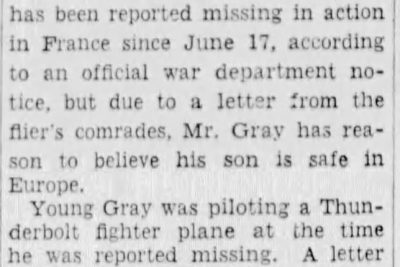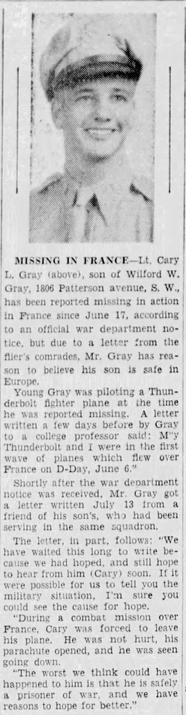 Lt. Cary L. Gray, son of Wilford W. Gray, 1806 Patterson Avenue, S.W., has been reported missing in action in France since June 17, according to an official war department notice, but due to a letter from the flier’s comrades, Mr. Gray has reason to believe his son is safe in Europe. Young Gray was piloting a Thunderbolt fighter plane at the time he was reported missing. A letter written a few days before by Gray to a college professor said: My Thunderbolt and I were in the first wave of plane which flew over France on D-Day, June 6. Shortly after the war department notice was received. Mr. Gray got a letter written July 13 from a friend of his son’s, who had been serving in the same squadron. The letter, in part, follows; “We have waited this long to write because we had hoped, and still hope to hear from him (Cary) soon. If it were possible for us to tell you the military situation, I’m sure you could see the cause for hope. During a combat mission over France, Cary was forced to leave his plane. He was not hurt, his parachute opened, ad he was seen going down. The worst we think could have happened to him is that he is safely a prisoner of war, and we have reasons to hope for better.”