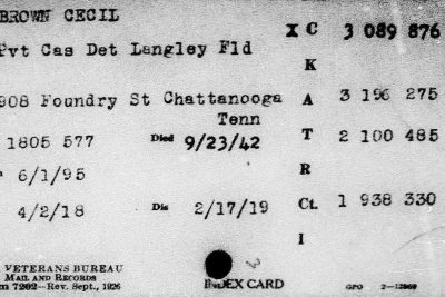 Cecil Brown was born on 1 June 1895 and enlisted on 2 April 1918. He was discharged on 17 February 1919. He died non battle 23 September 1942.