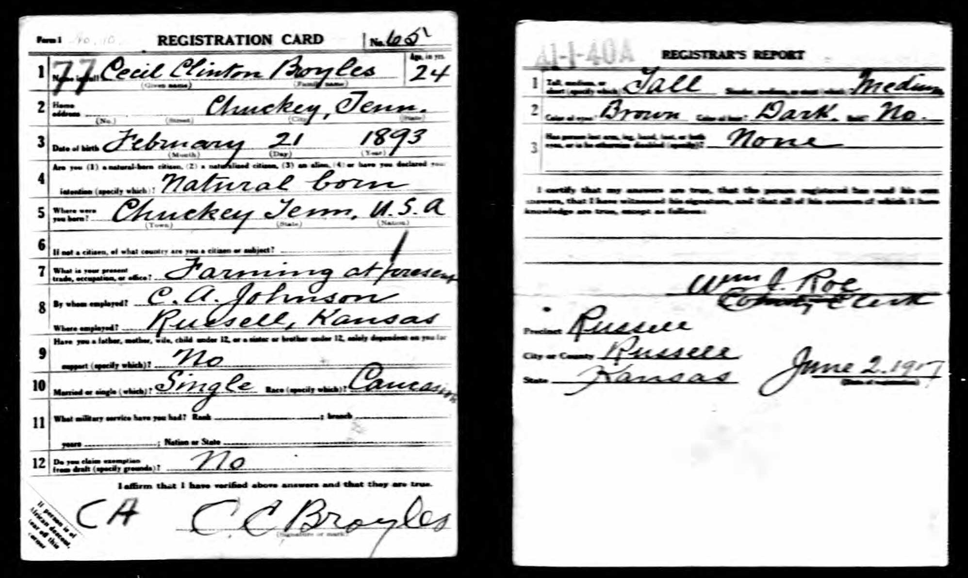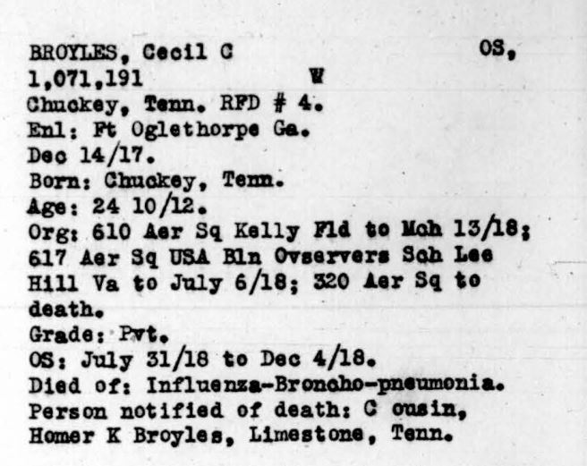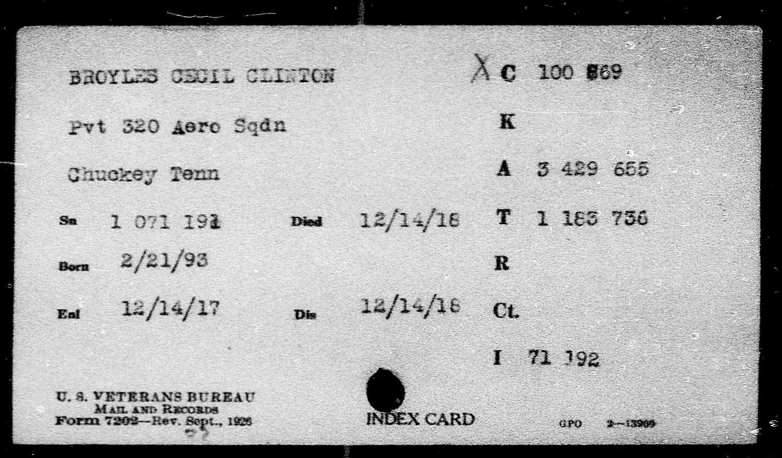 Cecil Clinton (Clint) Broyles was born in Chuckey, Tennessee. He was a school teacher before his enlistment on 14 December 1917 at Fort Oglethorpe in Georgia. He trained at Kelly Field, San Antonio, Texas, New Port News, Virginia, and Camp Marion. He sailed to Europe on 31 July 1918, arriving in August 1918 and died at the age of 24 of broncho pneumonia at the hospital in Ellis Island, N.Y. He was buried in Philadelphia Cemetery on 18 December 1918.