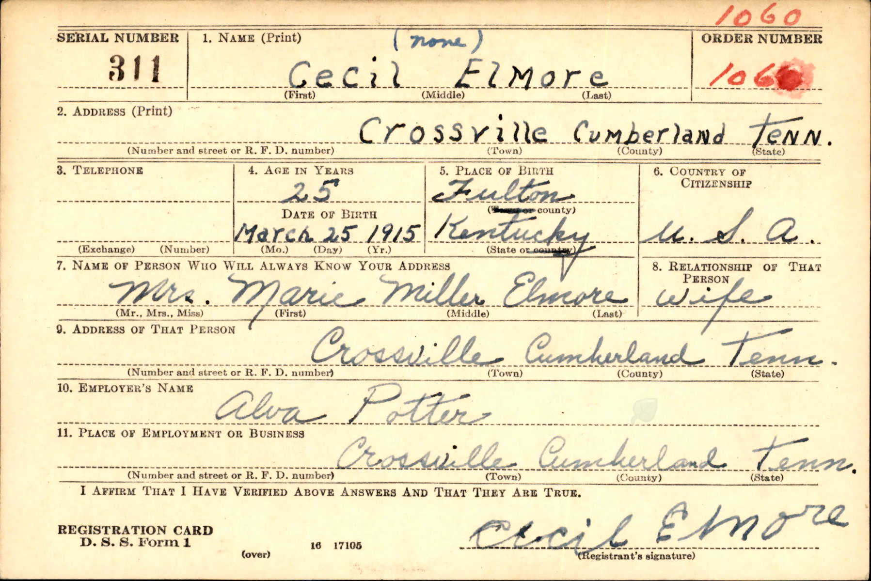 Cecil Elmore was born on 25 March 1915 at Fulton, Kentucky, the son of Samuel Elmore and Minnie Tosh. Husband of Marie Miller and father of Paul Elmore, Cecil MacArthur Elmore and a daughter.