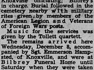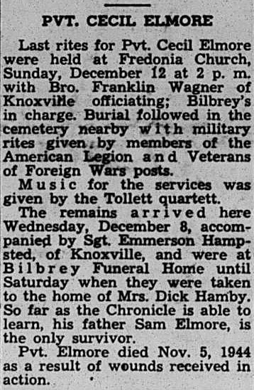 The remains arrived here Wednesday, December 8, accompanied by Sgt. Emmerson Hampsted of Knoxville, and were at Bilbrey Funeral Home until Saturday when they were taken to the home of Mrs. Dick Hamby. So far as the Chronicle is able to learn, his father Sam Elmore, is the only survivor. Pvt. Elmore died Nov. 5, 1944 as a result of wounds received in action.