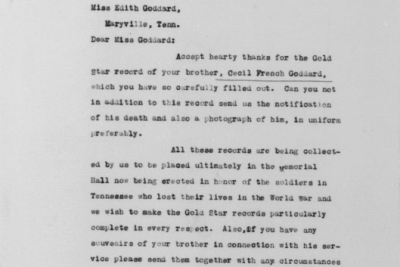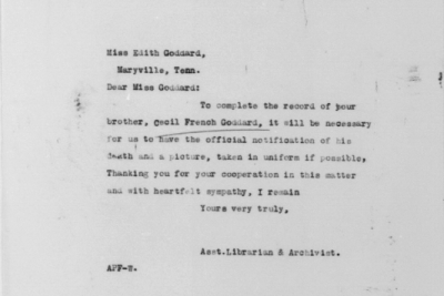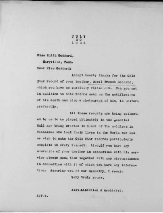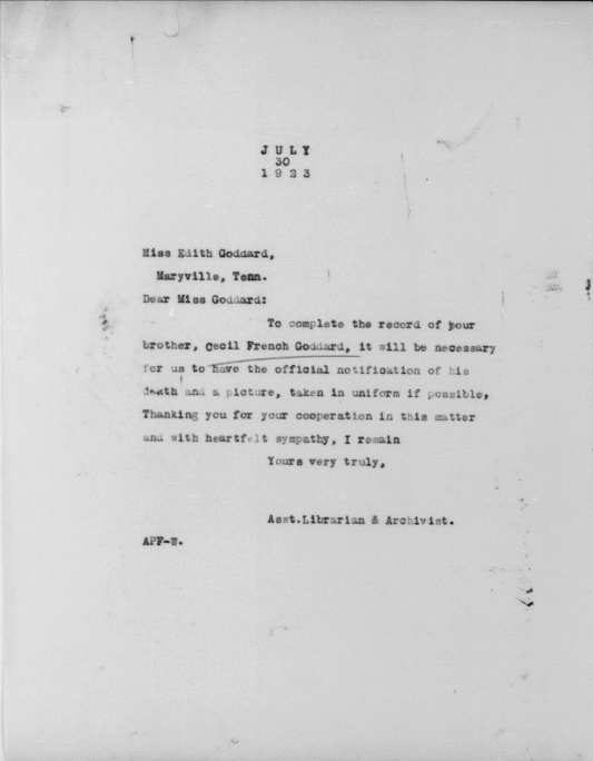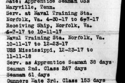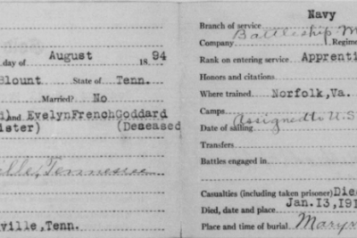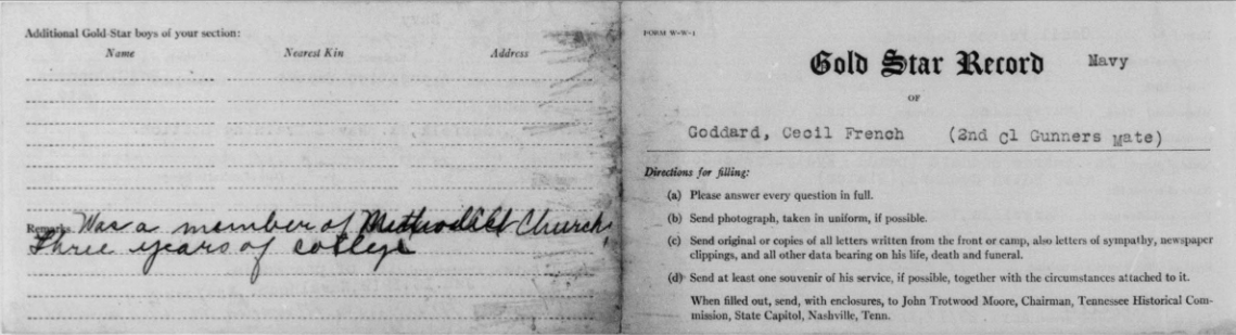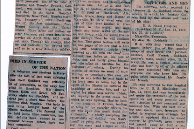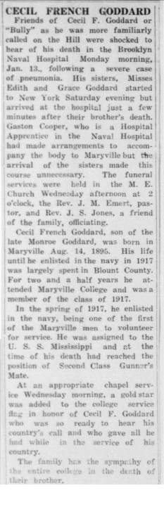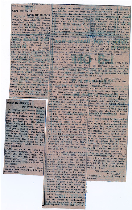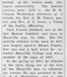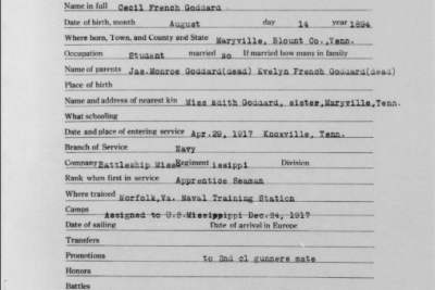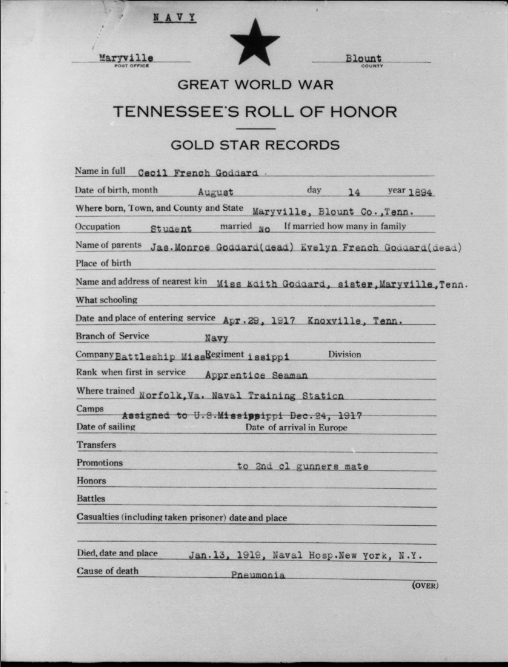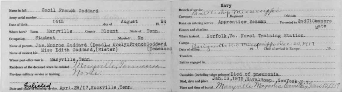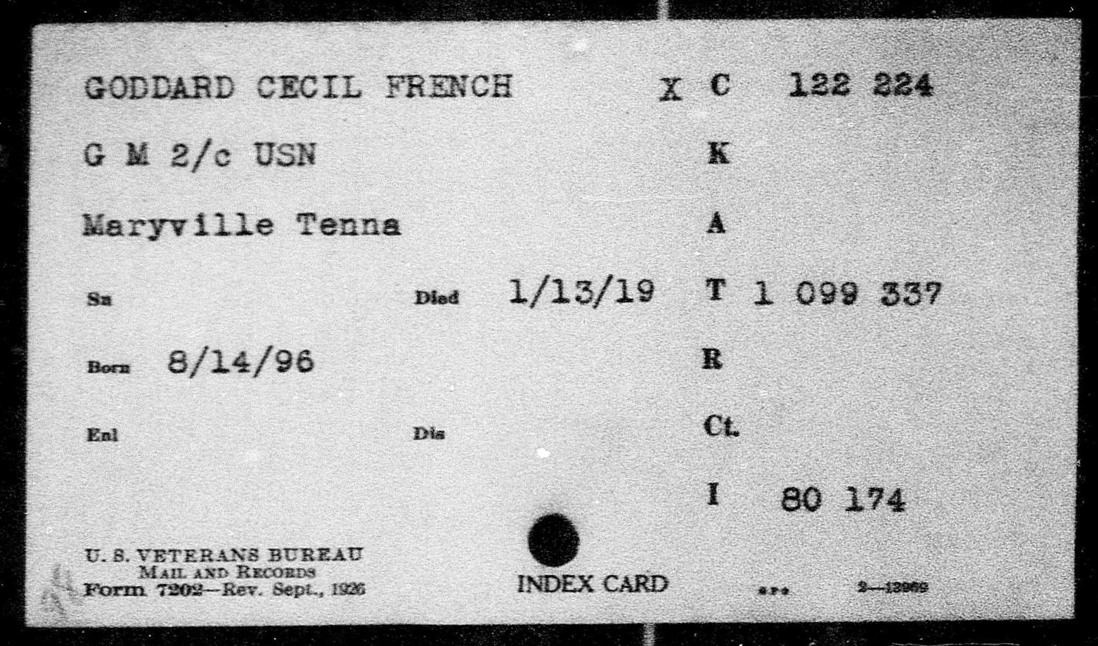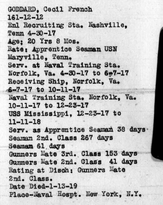 Cecil French Goddard was the son of Tomella E. French and James Monroe Goddard. He enlisted at the recruiting Station in Nashville, Tennessee on 30 April 1917. He served as a Gunner’s Mate 2nd on the USS Mississippi until 11 November 1918. He died of pneumonia at the Naval Hospital in Kings, New York.