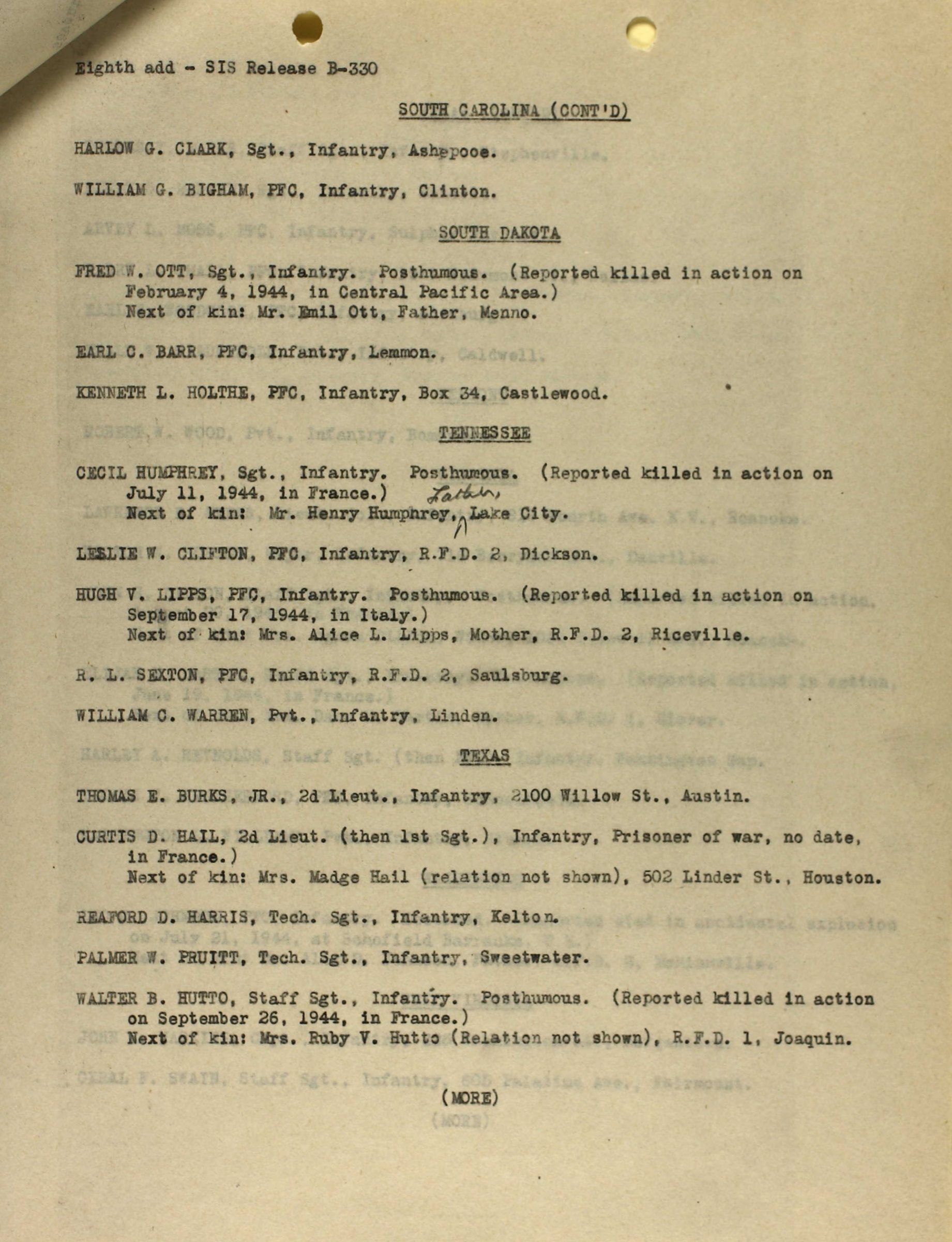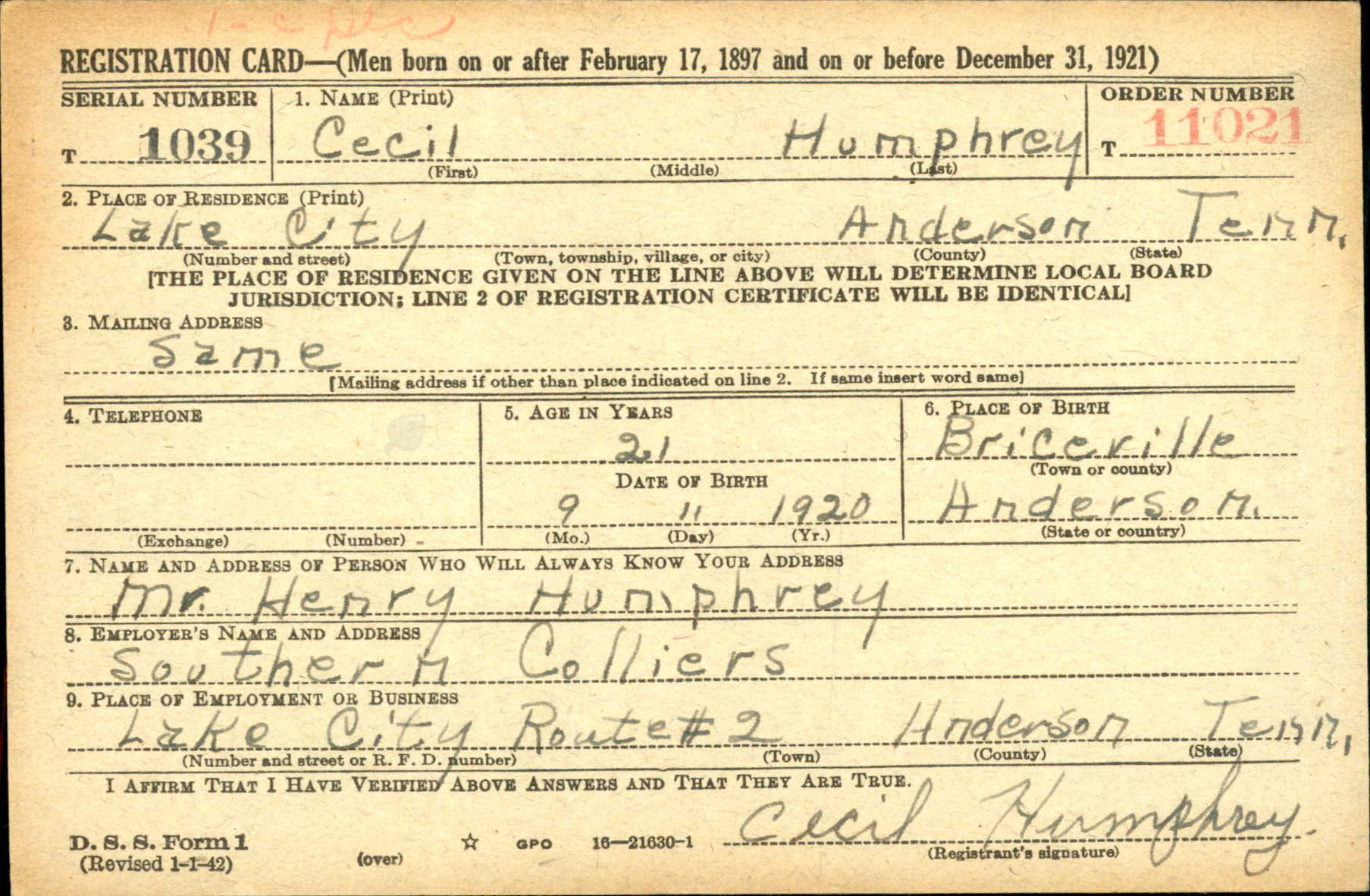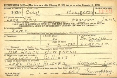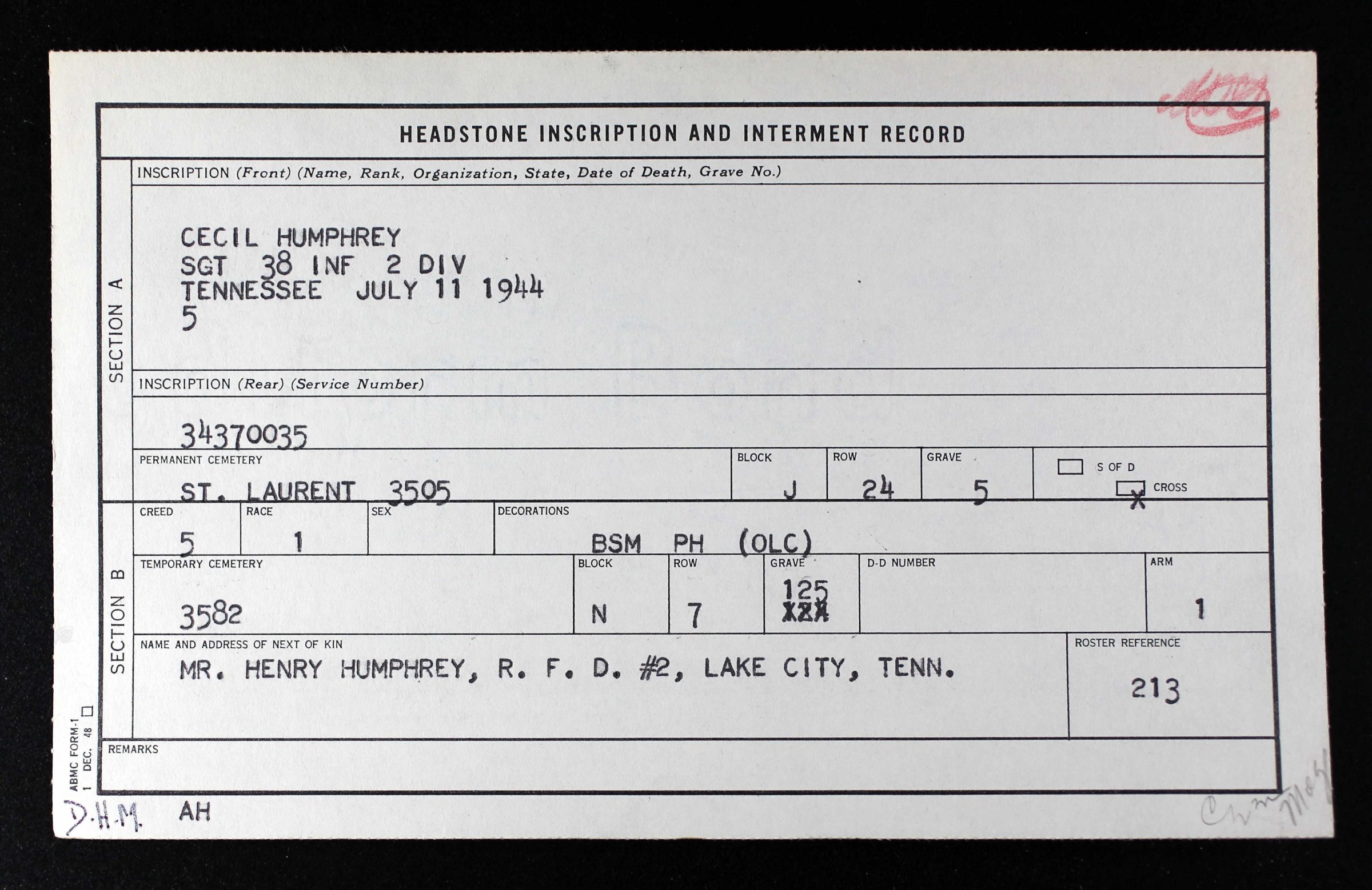 Staff Sergeant Cecil Humphrey of Lake City was born around 1921. He was the son of Henry and Louisa Weaver Humphrey. He served in the European theater of the war. He was awarded a Bronze Star for bravery. He died in France in 1944.