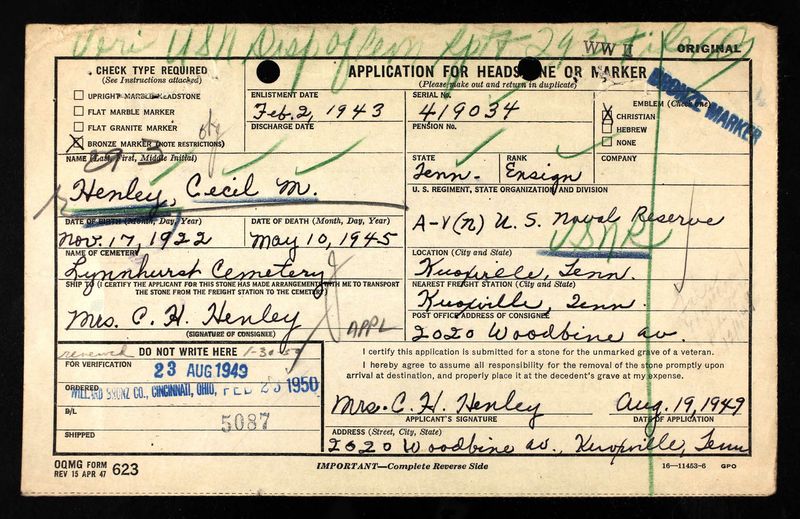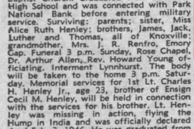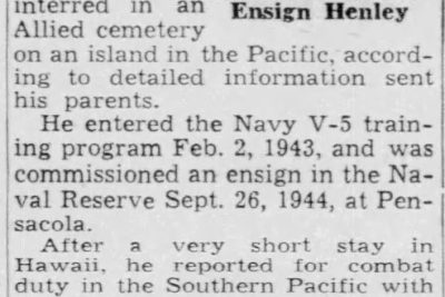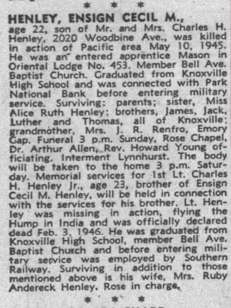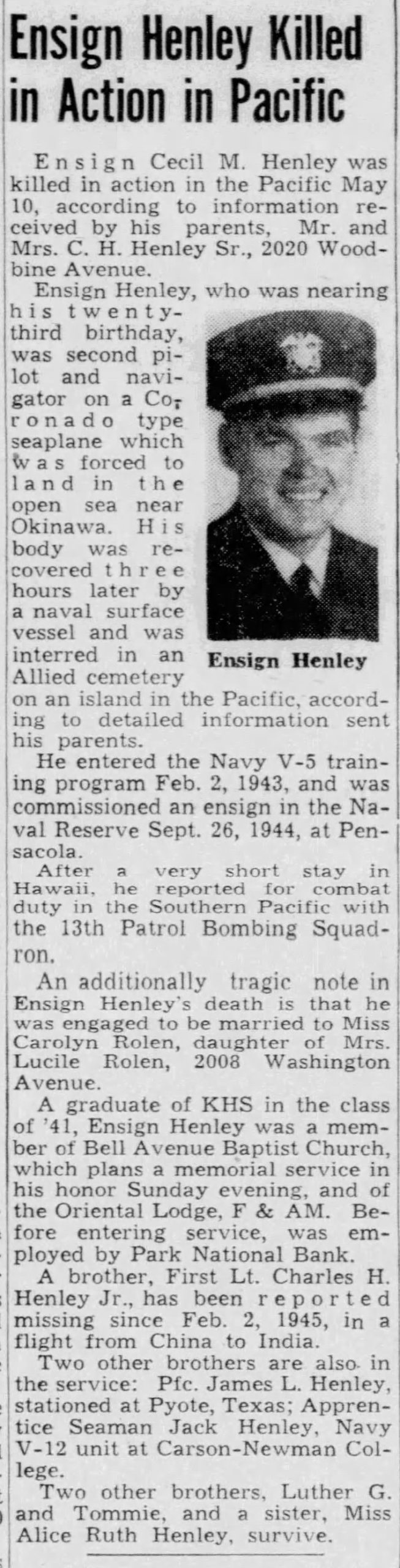 Ensign Cecil M. Henley was killed in action in the Pacific Ma 10, according to information received by his parents, Mr. and Mrs. C.H. Henley Sr. 2020 Woodbine Avenue. Ensign Henley, who was nearing his twenty-third birthday, was second pilot and navigator on a Coronado type seaplane which was forced to land in the open sea near Okinawa. His body was recovered three hours later by a naval surface vessel and was interred in an Allied Cemetery on an island in the Pacific, according to detailed information sent to his parents. He entered the Navy V-5 training program Feb. 2, 1943, and was commissioned an ensign in the Naval Reserve Sept. 26, 1944, at Pensacola. After a very short stay in Hawaii, he reported for combat duty in the Southern Pacific with the 13th Patrol Bombing Squadron. An additionally tragic note in Ensign Henley’s death is that he was engaged to be married to Miss Carolyn Rolen, 2008 Washington Avenue. A graduate of KHS in the class of ’41, Ensign Henley was a member of Bell Avenue Baptist Church which plans a memorial service in his honor, and of the Oriental Lodge, F&AM. Before entering service, was employed by Park National Bank.