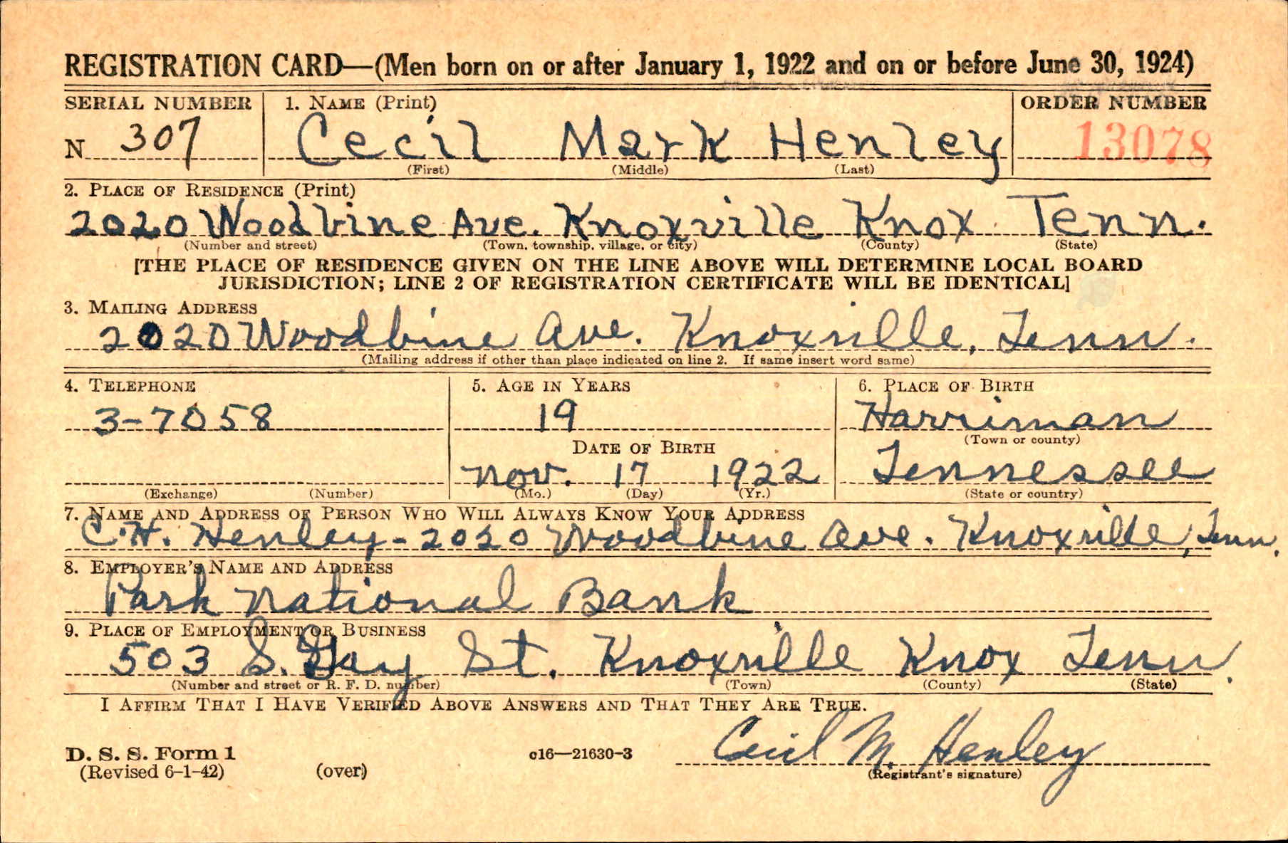 Cecil Mark Henley was the son of Charles Haddon Henley Sr. and Alice Elizabeth Ann Renfro. His siblings were Charles H. Henley Jr. (also died in WWII and honored on the memorial) , James L. Henley, Samuel J. Henley, Luther L. Henley, Thomas R. Henley, Alice Henley, Jack Henley and Luke Henley. He was a graduated from KHS in January 1942 and was employed by Southern Railway as a foreman. He also had ROTC training.