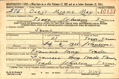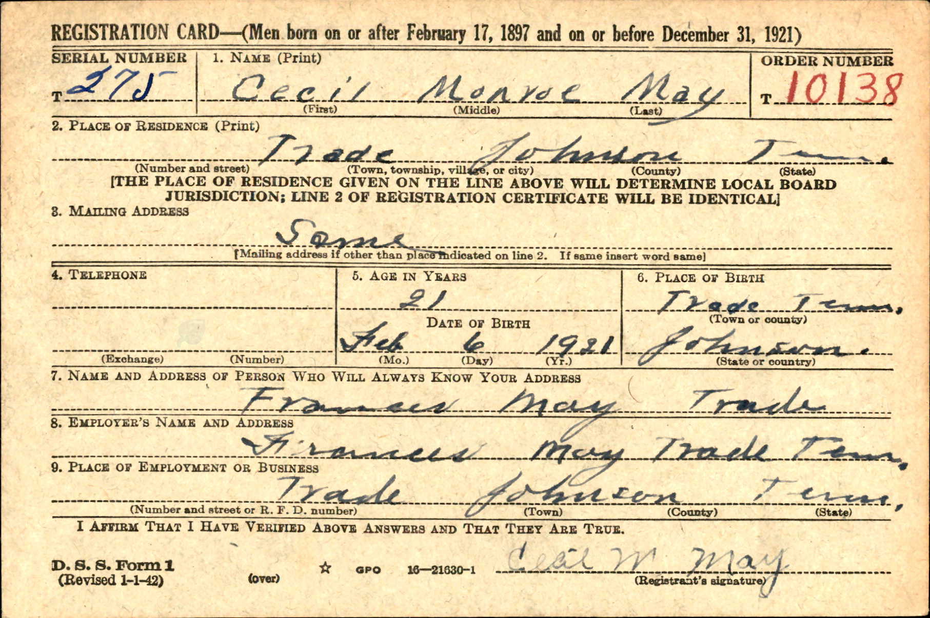 Cecil Monroe May was born in Trade, Johnson County, Tenn. to John May and Frances Oliver.