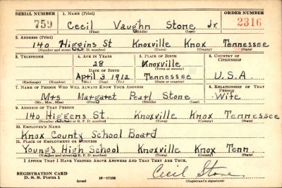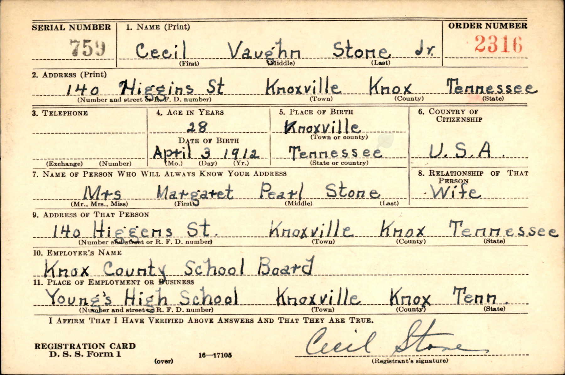 Cecil Vaughn Stone Jr. was born in Knoxville, Tennessee to Cecil Vaughn Stone Sr. and Myrtle Anne Henry. He was married to Margaret Pearl Bible. Cecil Stone was a teacher at Young High School in Knoxville, Tn.