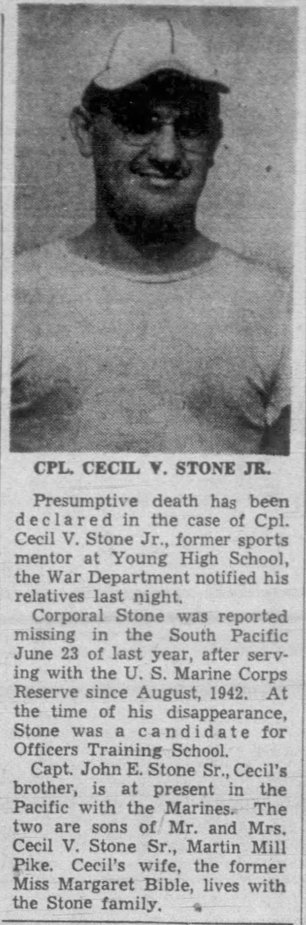 Presumptive death has been declared in the case of Cpl. Cecil V. Stone Jr., former sports mentor at Young High School, the War Department notified his relatives last night. Corporal Stone was reported missing in the South Pacific June 23 of last year, after serving with the U.S. Marine Corps Reserve since August, 1942. At the time of his disappearance, Stone was a candidate for Officers Training School. Capt. John E. Stone Sr., Cecil’s brother, is at present in the Pacific with the Marines. The two are sons of Mr. and Mrs. Cecil V. Stone Sr., Martin Mill Pike. Cecil’s wife, the former Miss Margaret Bible, lives with the Stone family.