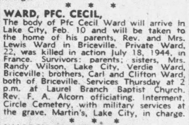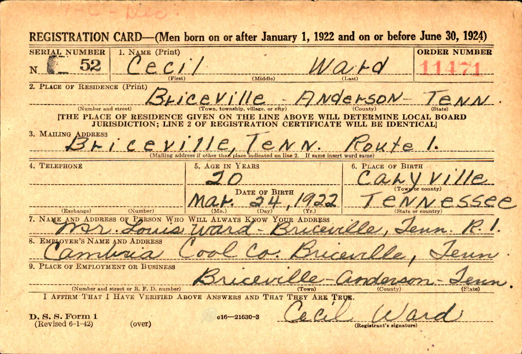 Cecil Ward was born at Caryville, Tennessee, the son of Lewis Ward and Stella Duncan.