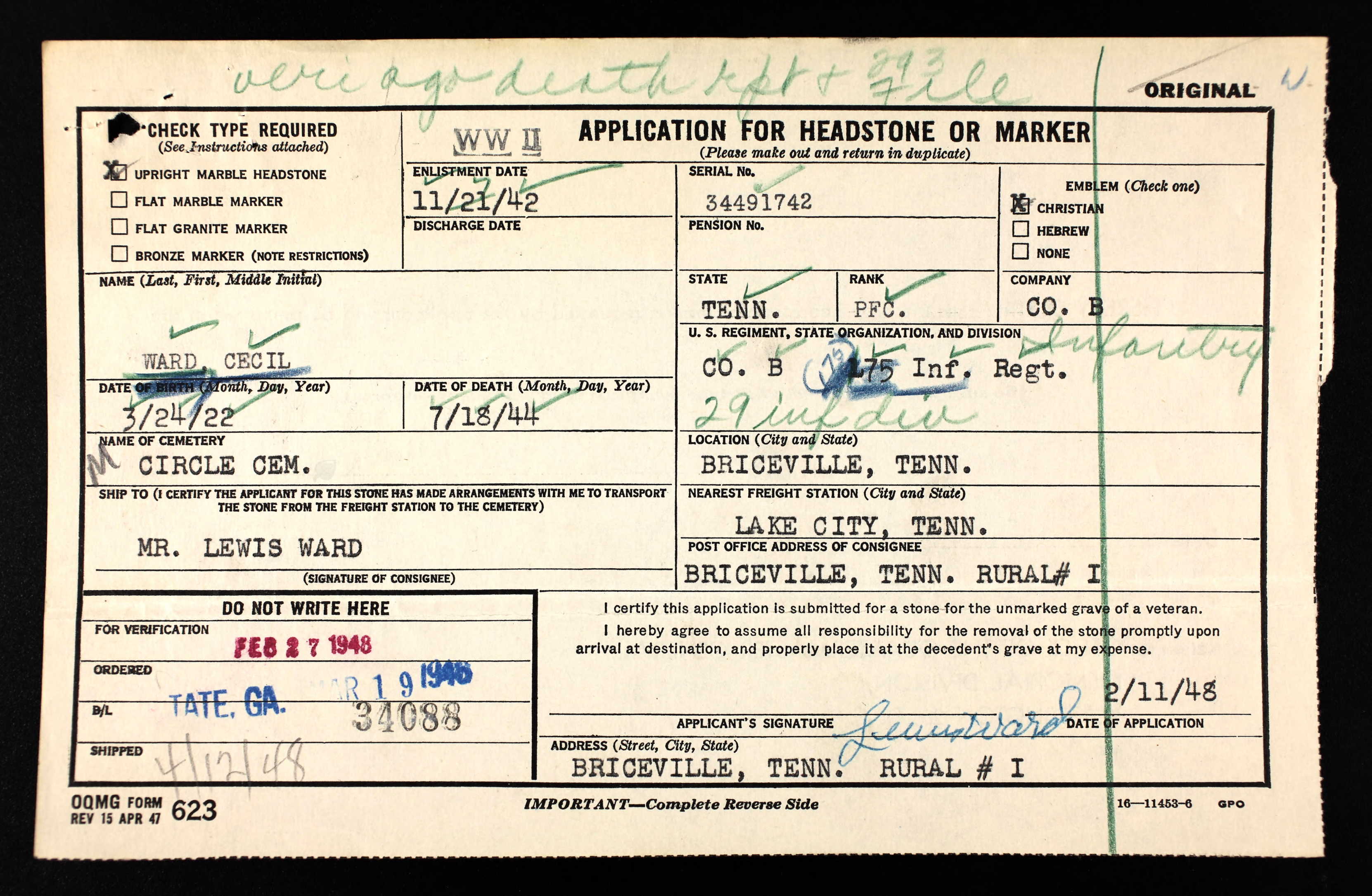He served with the 175th Infantry Regiment, 29th Infantry Division, Company B and was killed in action in France.