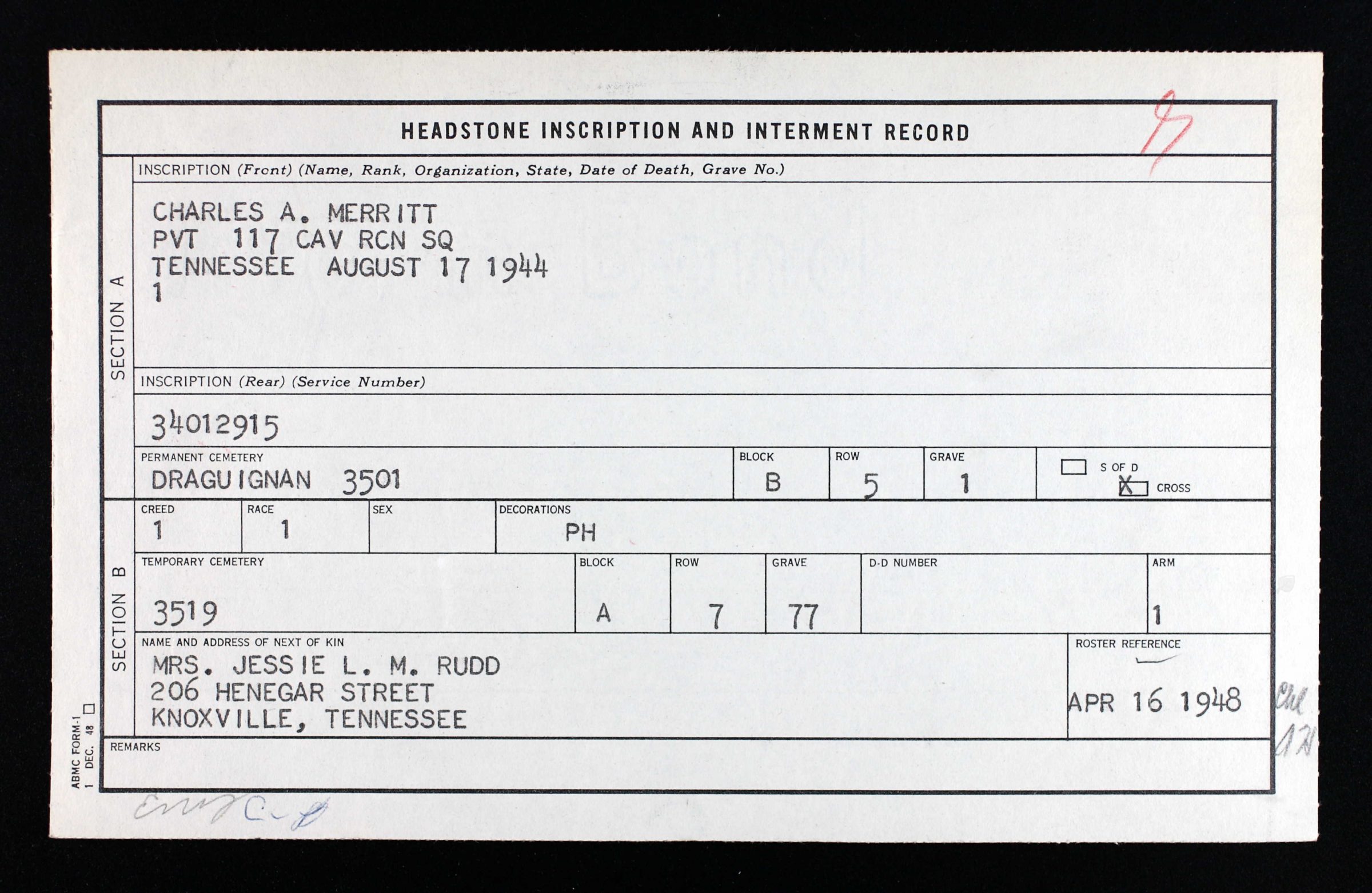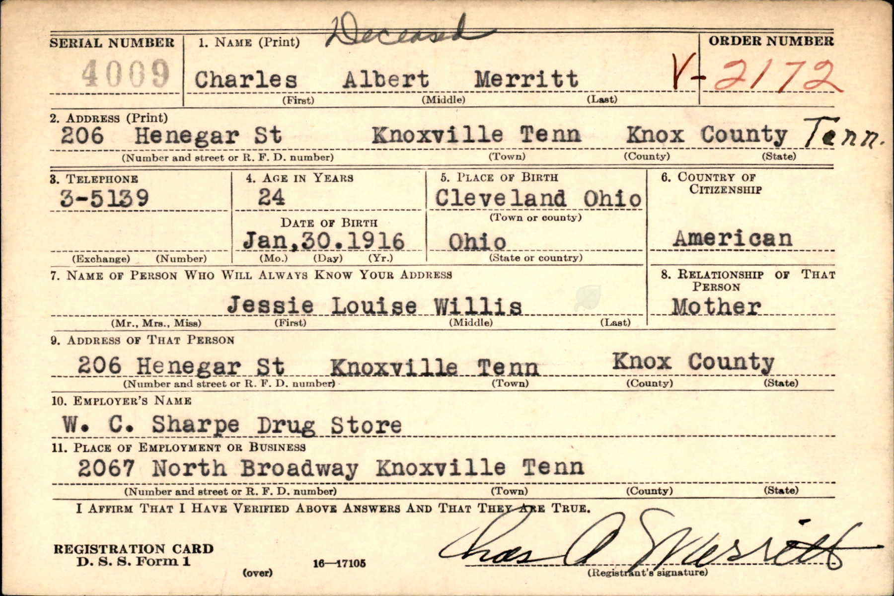Charles Albert Merritt was born in Cleveland, OH, in 1916 to Charles Franklin Merritt and Jessie Louise Willis Merritt. Siblings: Emmaly Merritt and Phillip R. Merritt. Moved to Knoxville sometime between 1920 and 1930. He enlisted on January 10, 1941, in Fort Oglethorpe, GA
