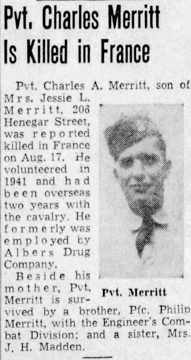 Pvt. Charles A. Merritt, son of Mrs. Jessie L. Merritt, 206 Henegar Street, was reported killed in France on Aug. 17. He volunteered in 1941 and had been overseas two years with the cavalry. He formerly was employed by Albers Drug Company. Beside his mother, Pvt. Merritt is survived by a brother, Pfc. Philip Merritt, witht he Engineer’s Company Division; and a sister, Mrs. J.H. Madden.