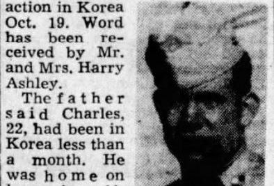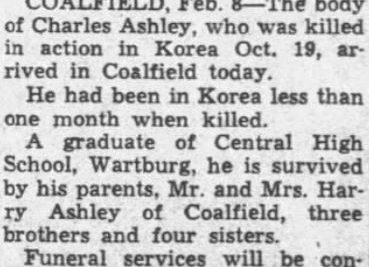 Coalfield, Tenn., Nov. 17 – Pfc. Charles Ashley was killed in action in Korea Oct. 19. Word has been received by Mr. and Mrs. Harry Ashley. The father said Charles, 22, had been in Korea less than a month. He was home on leave Aug. 11. The young soldier was a graduate of Central High School in Wartburg where he was an outstanding student leader. He also leaves three brothers and four sisters.