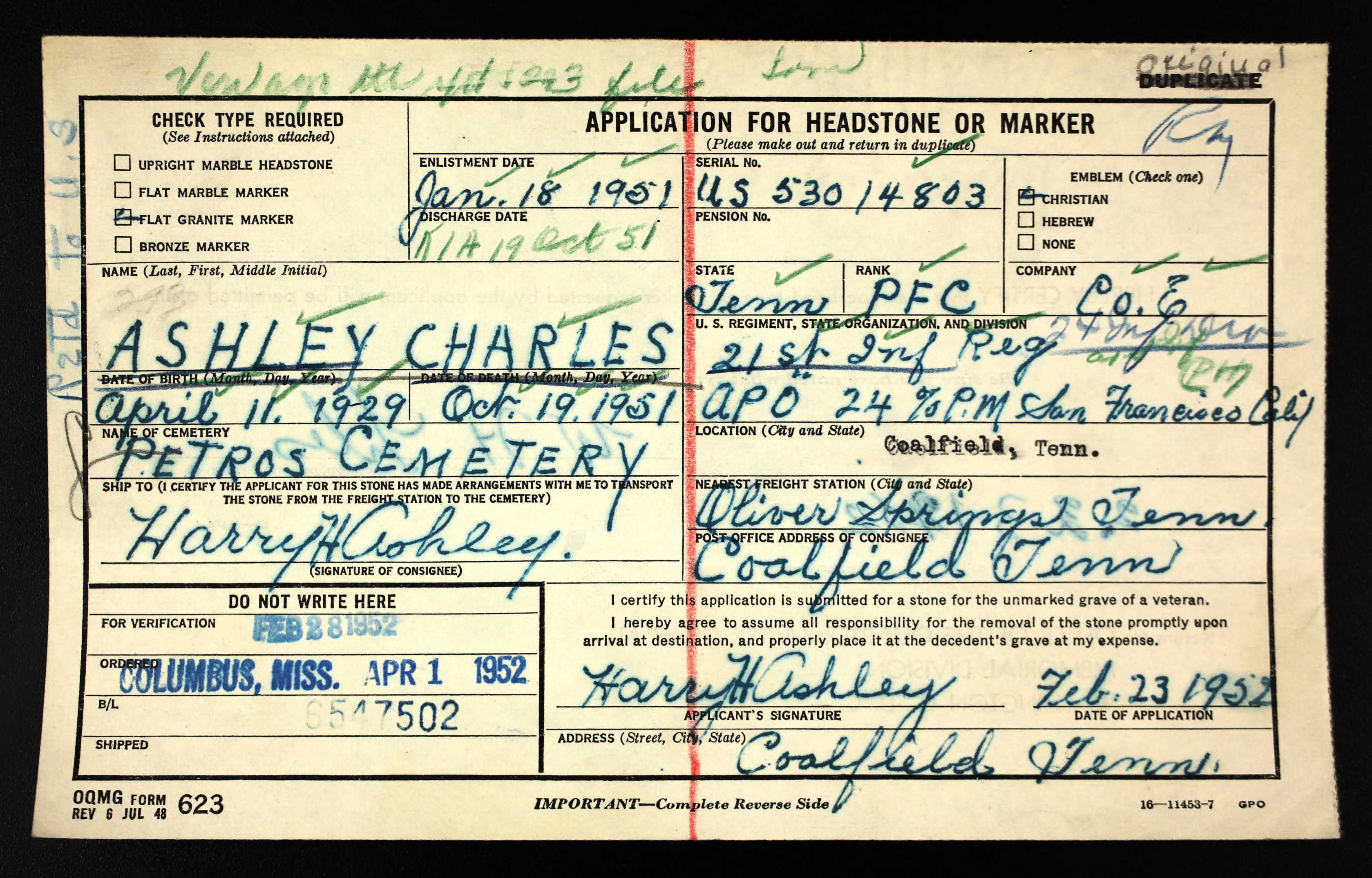 Private First Class Charles Ashley was survived by parents, Mr. and Mrs. Harry Ashley; two brothers, George and Roy, Clinton, Tennessee; two sisters, Mrs. Don Fritts, Miss Roberta Ashley; Colafield half brother, Condon Ashley, Coalfield; half-sisters, Mrs. Jos. Woods, Coalfield, Mrs. Chester Cetnaroski, Los Angeles, Calif.