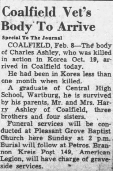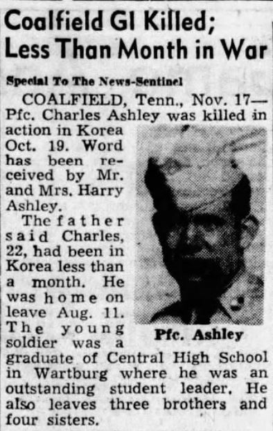 Coalfield, Tenn., Nov. 17 – Pfc. Charles Ashley was killed in action in Korea Oct. 19. Word has been received by Mr. and Mrs. Harry Ashley. The father said Charles, 22, had been in Korea less than a month. He was home on leave Aug. 11. The young soldier was a graduate of Central High School in Wartburg where he was an outstanding student leader. He also leaves three brothers and four sisters.