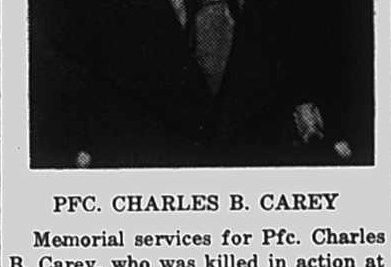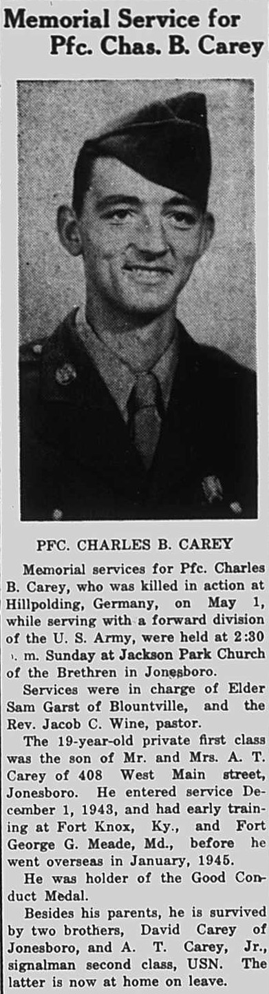 Memorial services for Pfc. Charles B. Carey, who was killed in action at Hillpolding, Germany, on May 1, while serving with a forward division of the U.S. Army, were held at Jackson Park Church of the Brethren in Jonesboro.
