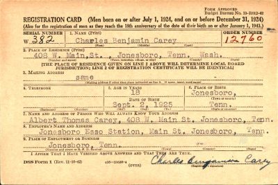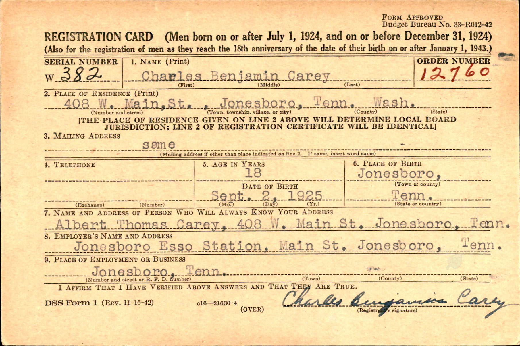 Charles Benjamin Carey was born 2 September 1925, Jonesborough, Washington County, Tennessee