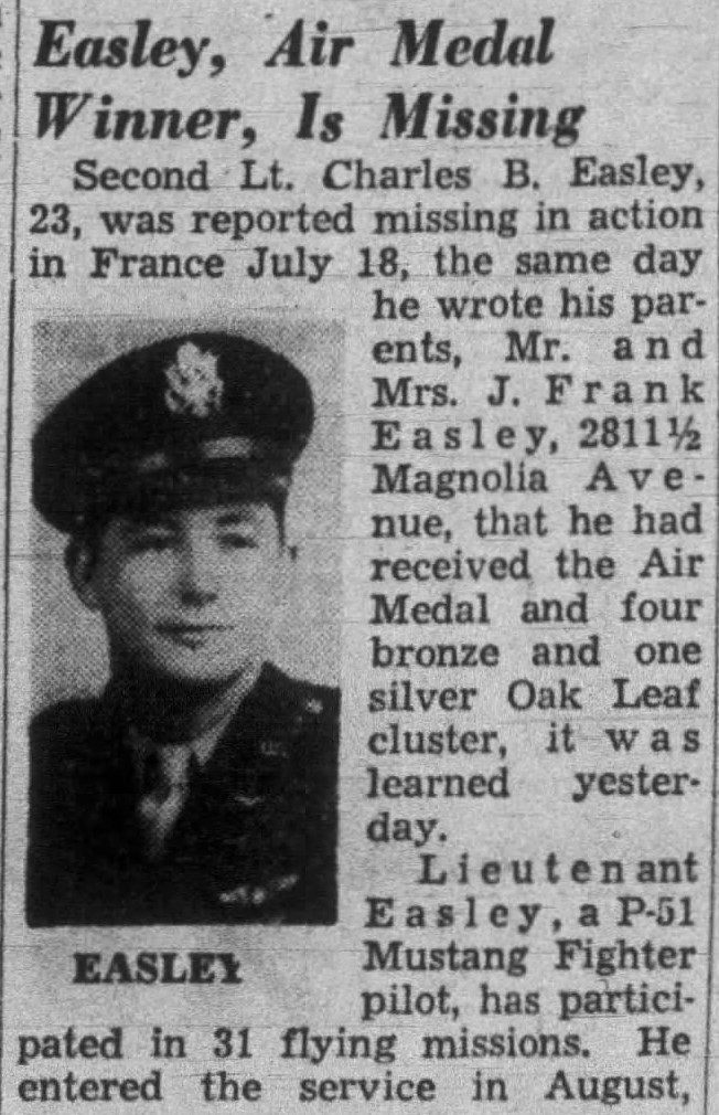 Second Lt. Charles B. Easley, 23, was reported missing in action in France July 18, the same day he wrote his parents, Mr. and Mrs. J. Frank Easley, 2811 ½ Magnolia Avenue, that he had received the Air Medal and four bronze and one silver Oak Leaf cluster, it was learned yesterday. Lieutenant Easley, a P-51 Mustang Fighter pilot, has participated in 31 flying missions. He enteres the service in August, 1942, and has been overseas since March of this year.