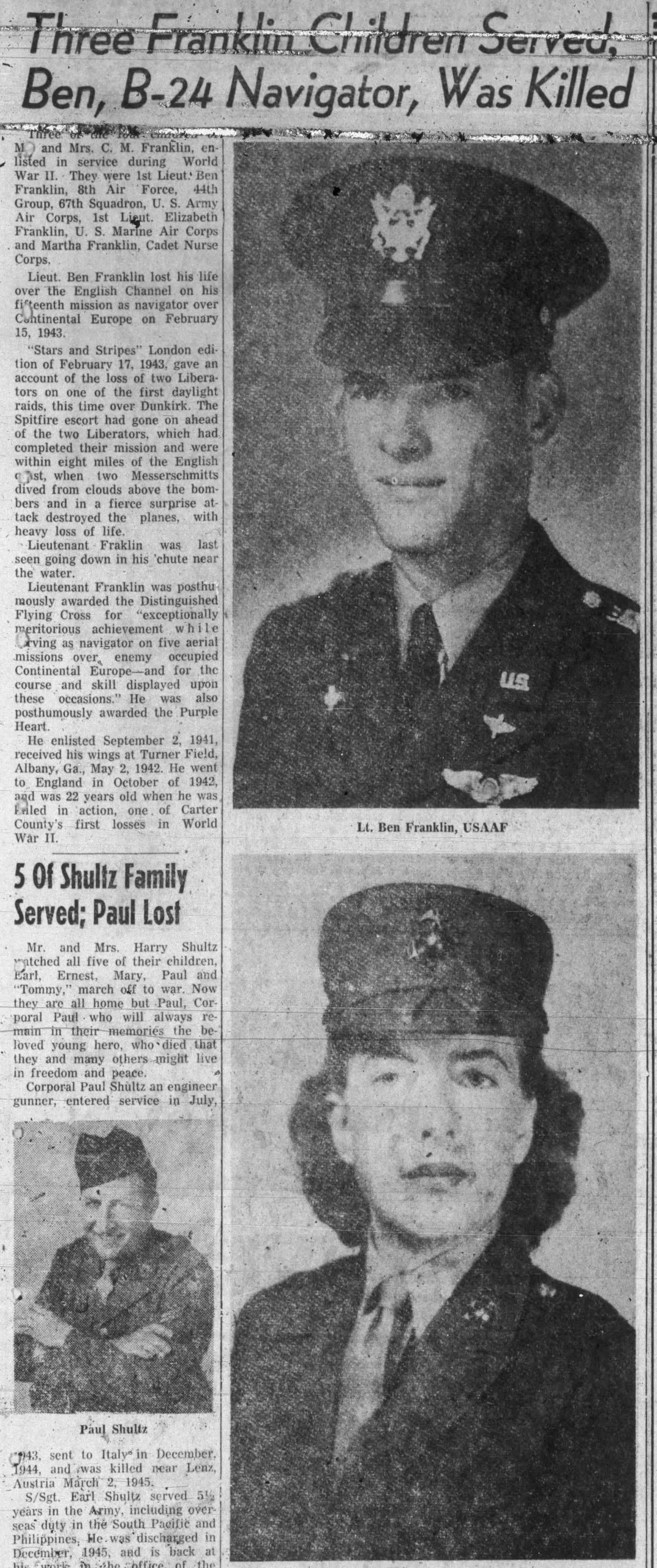 Three of the four children of Mr. and Mrs. C.M. Franklin, enlisted in the service during World War II. They were 1st Lieut. Ben Franklin, 8th Air Force, 44th Group, 67th Squadron, U.S. Army Air Corps, 1st Lieut. Elizabeth Franklin, U.S. Marine Air Corps and Martha Franklin, Cadet Nurce Corps.