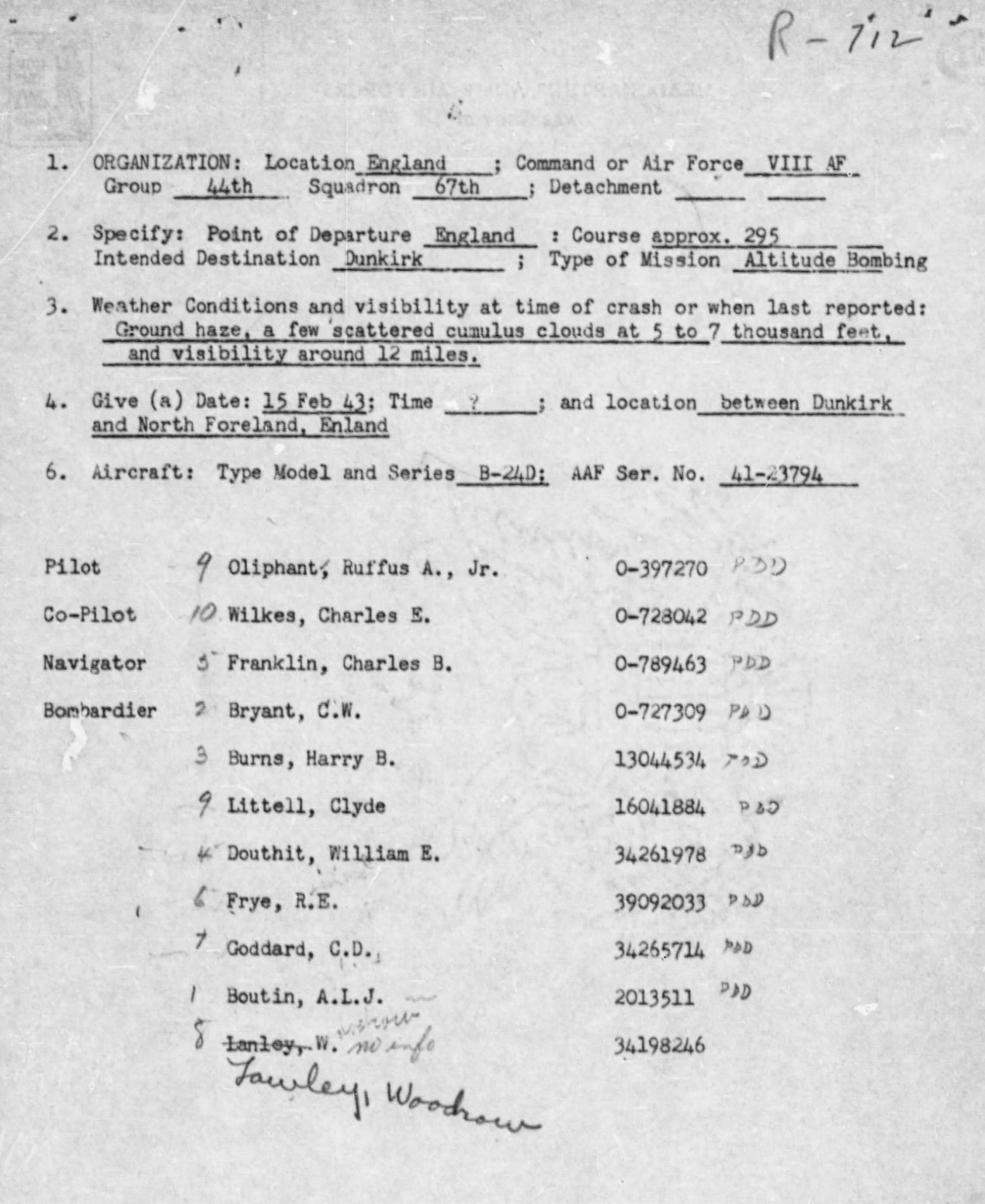 1st Lieutenant Charles B. Franklin #O-789463, US Army Air Forces, was assigned to the 67th Bomber Squadron, 44th Bomb Group Heavy, flying as a Navigator on B-24’s with serialnumber 41-23794, out of Shipdham, England in the air offensive against Nazi Europe. His B-24 was shot down on 15th of February 1943.