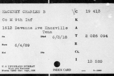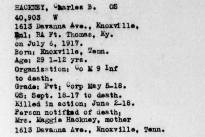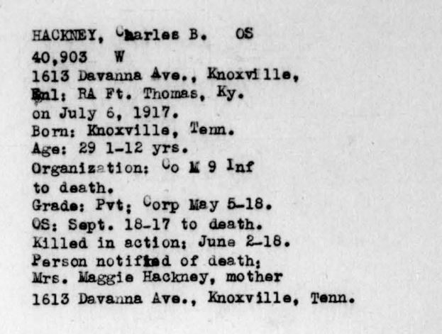 He volunteered his services for the war at Knoxville in May 1917 and was assigned to Company M, 9th Infantry, 2nd Division. His organization sailed for overseas duty in November 1917. He was killed in action June 2, 1918, in the American defense of the Chateau-Thierry sector in the Marne salient. He died at the age of 29 and is interred at A,11,79, Aisne-Marne American Cemetery, Belleau, France.