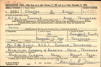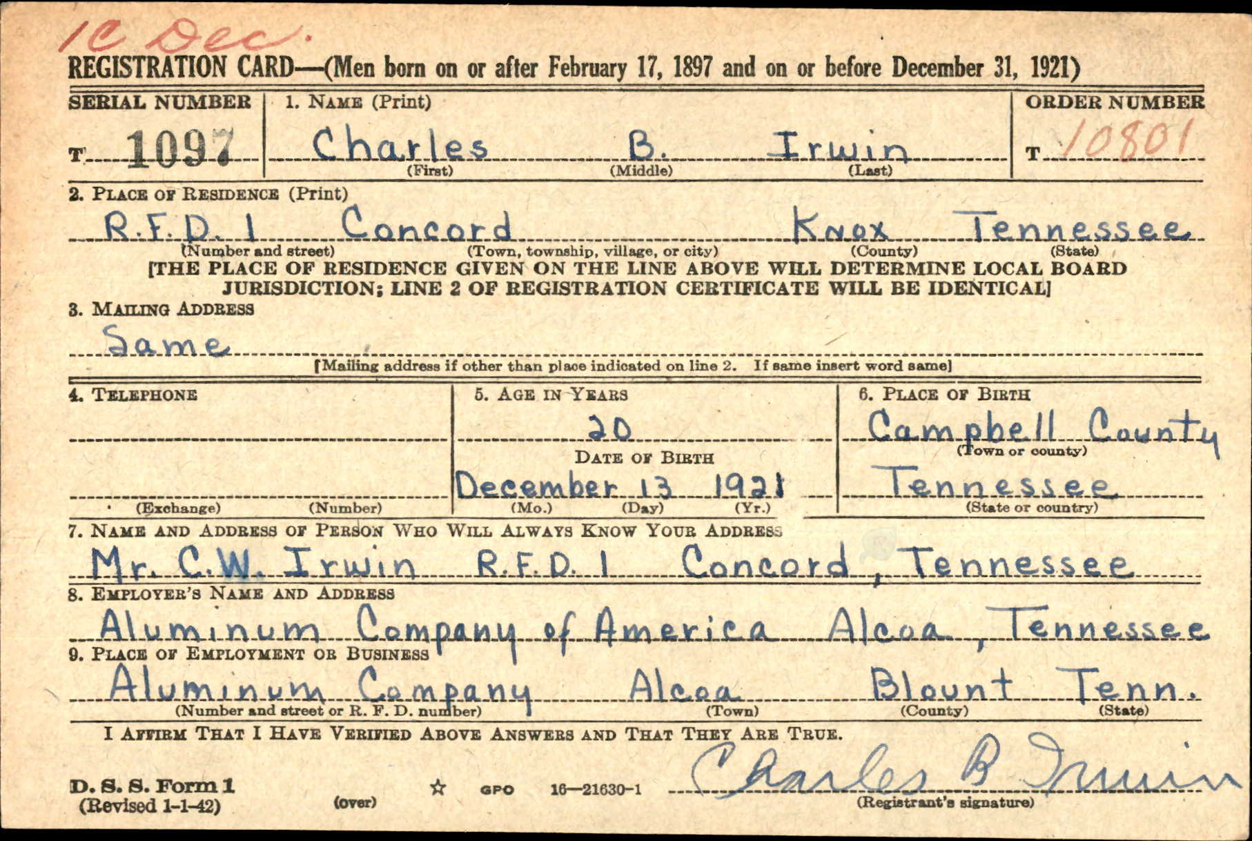 Staff Sergeant Charles Baker Irwin was born December 13, 1921, to Charles W. “Charlie” Irwin and Grace Cleo Baker and was the only son of six children. His sisters were Trula, Nannie, Jo, Ruth, Jewell, and Nelle. His father was a dairy farmer who was forced to move twice for TVA reservoir projects. He first was forced to move in 1935 from a farm in the Norris area to make way for Norris lake. He moved to Concord. He then was forced to move for the creation of Fort Loudoun Lake and bought land on Concord Road where the family lived in 1940.