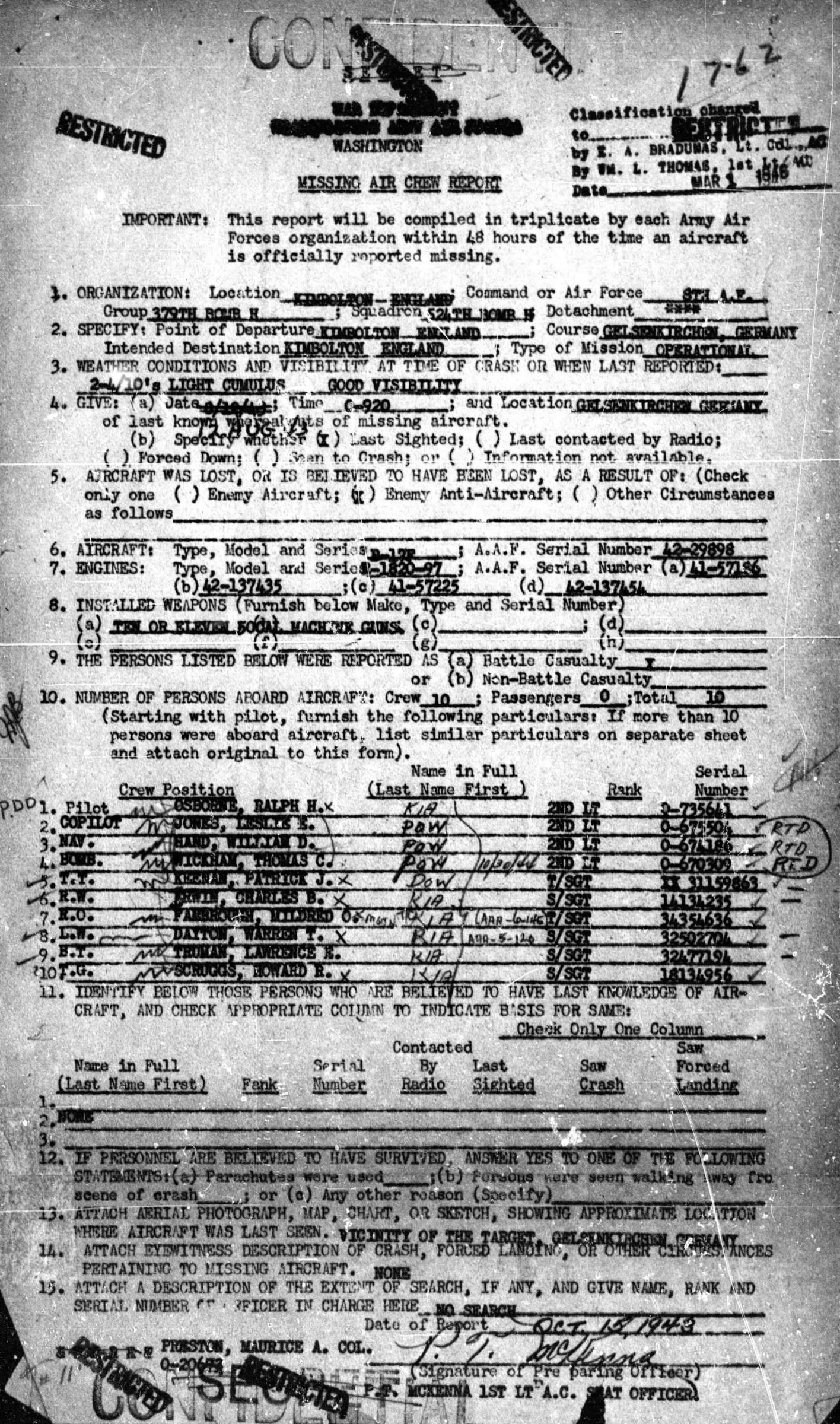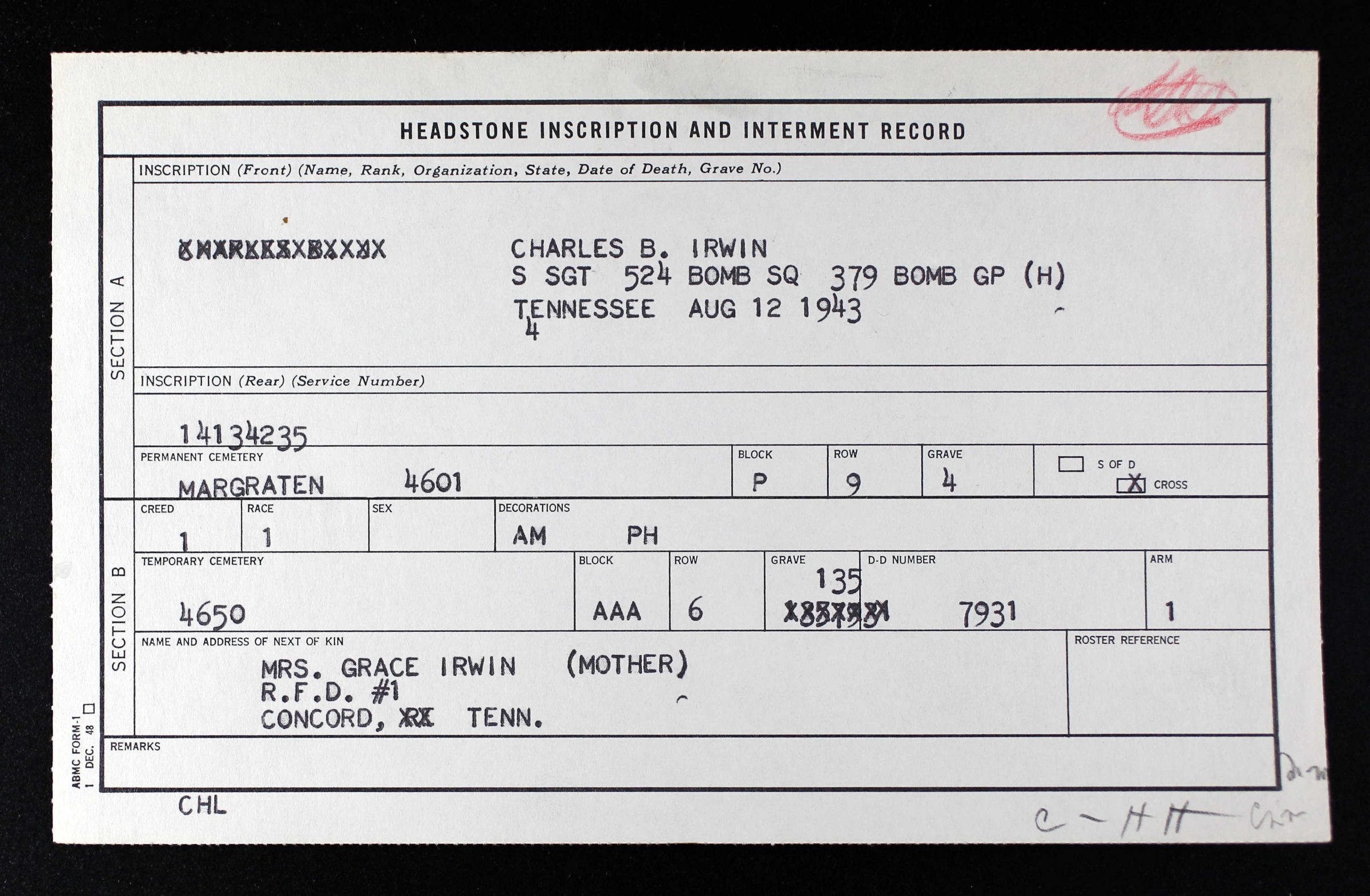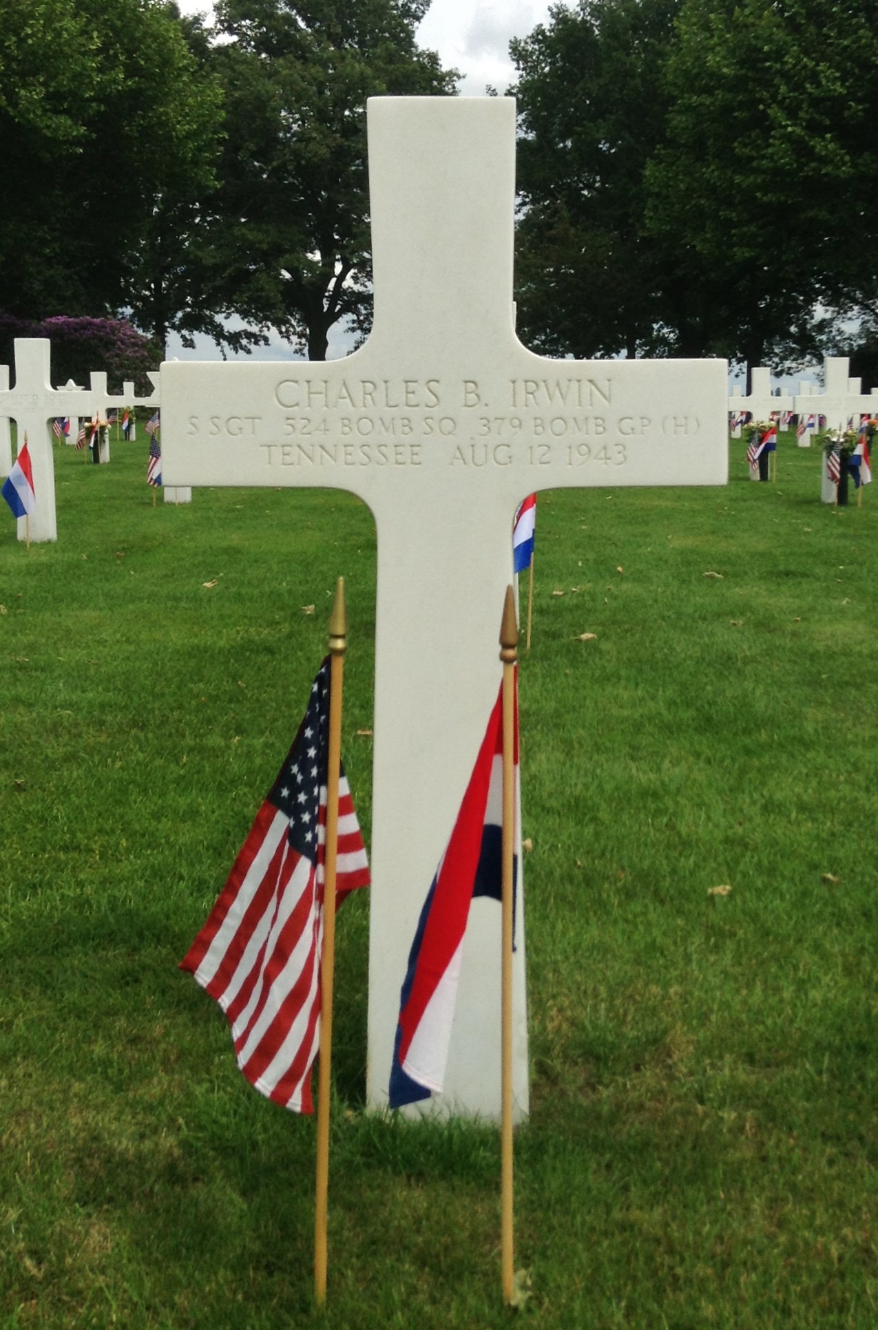 Aircraft B-17F with serial number 42-29898, nickname Scarlett O´Hara, departed from Kimbolton, England on an operational mission to the Oil Refinery in Gelsenkirchen, Germany. The aircraft was attacked by fighters near Bonn, starting a fire in the cockpit area after the bomb run. The aircraft crashed near Metternich.S/Sgt Irwin was initially buried at Cross-Mernich cemetery near Weilerswist at the North-wester side in a common grave on 16 August 1943.