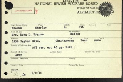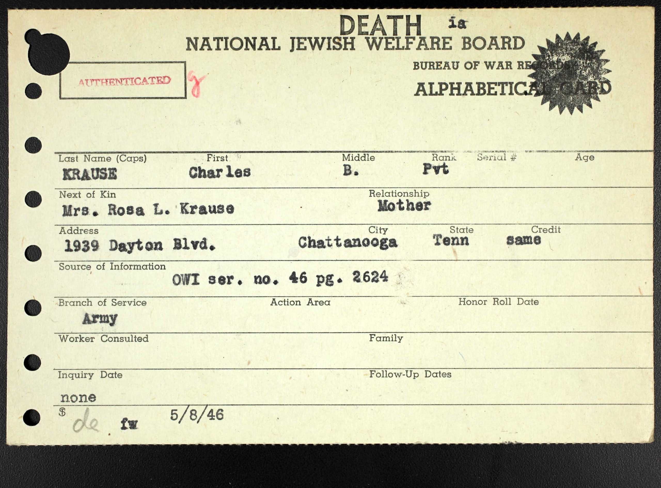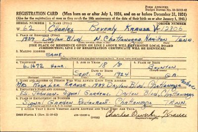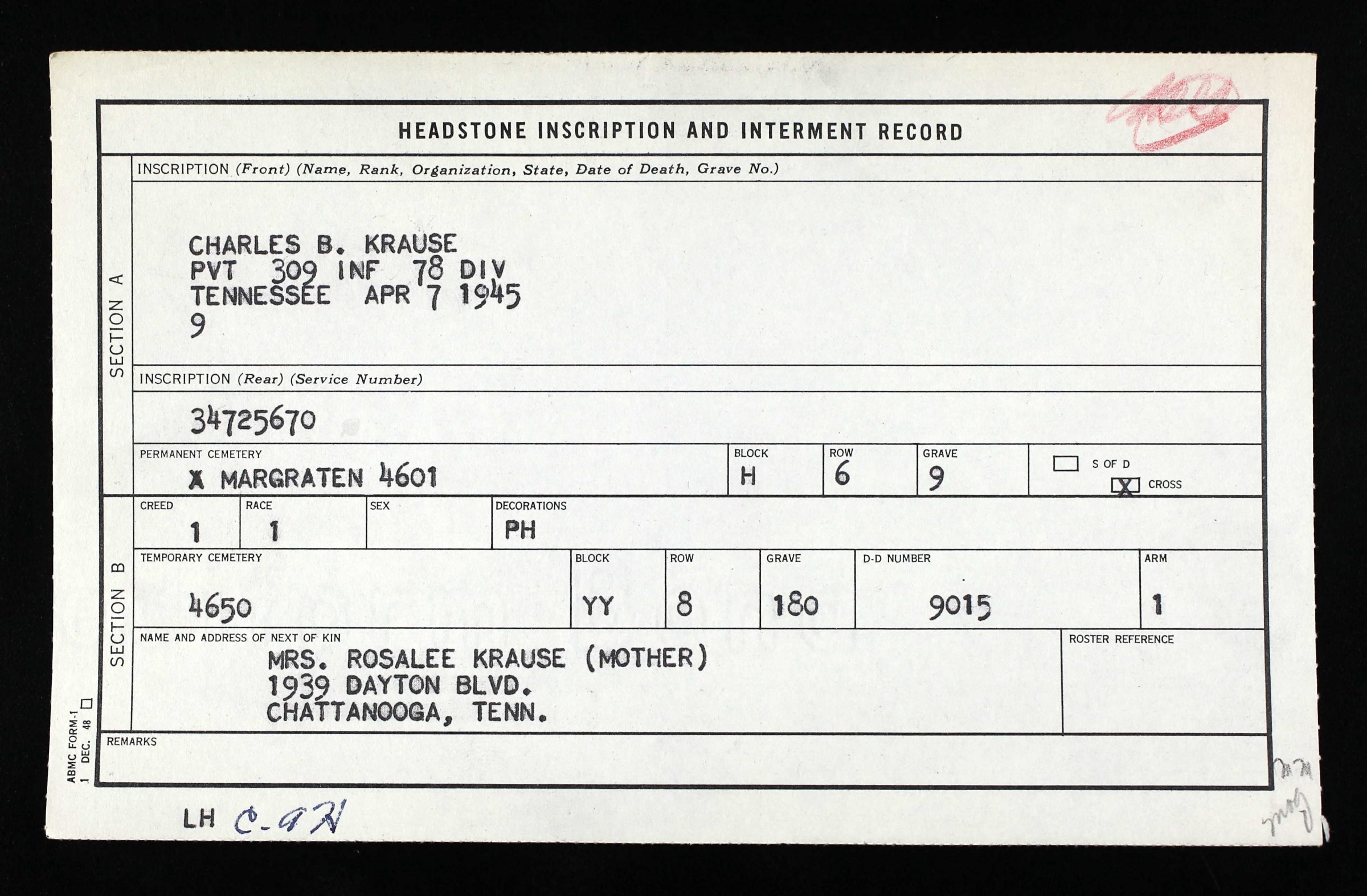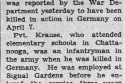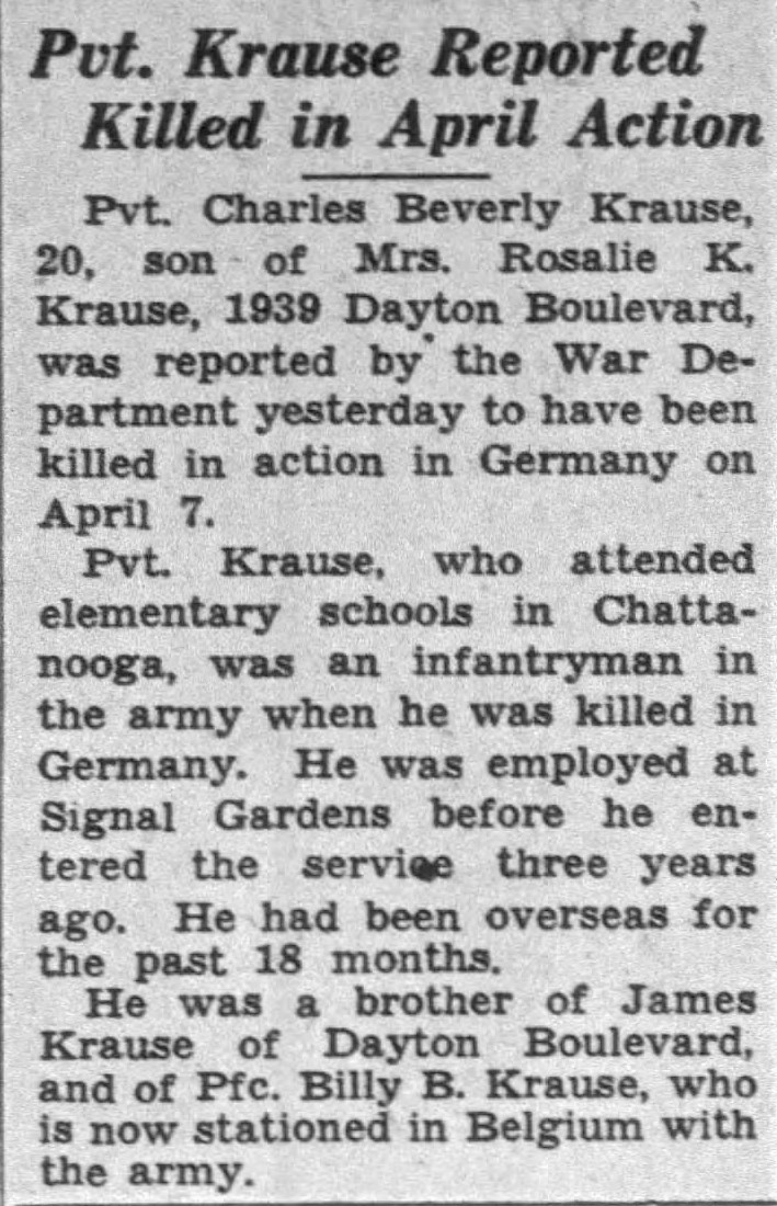 Pvt. Charles Beverly Krause, 20, son of Mrs. Rosalie K. Krause, 1939 Dayton Boulevard, was reported by the War Department yesterday to have been killed in action in Germany on April 7. Pvt. Krause, who attended elemetary schools in Chattanooga, was an infantryman in the army when he was killed in Germany. He was employed at Signal Gardens before he entered the service three years ago. He had been overseas for the past 18 months.
