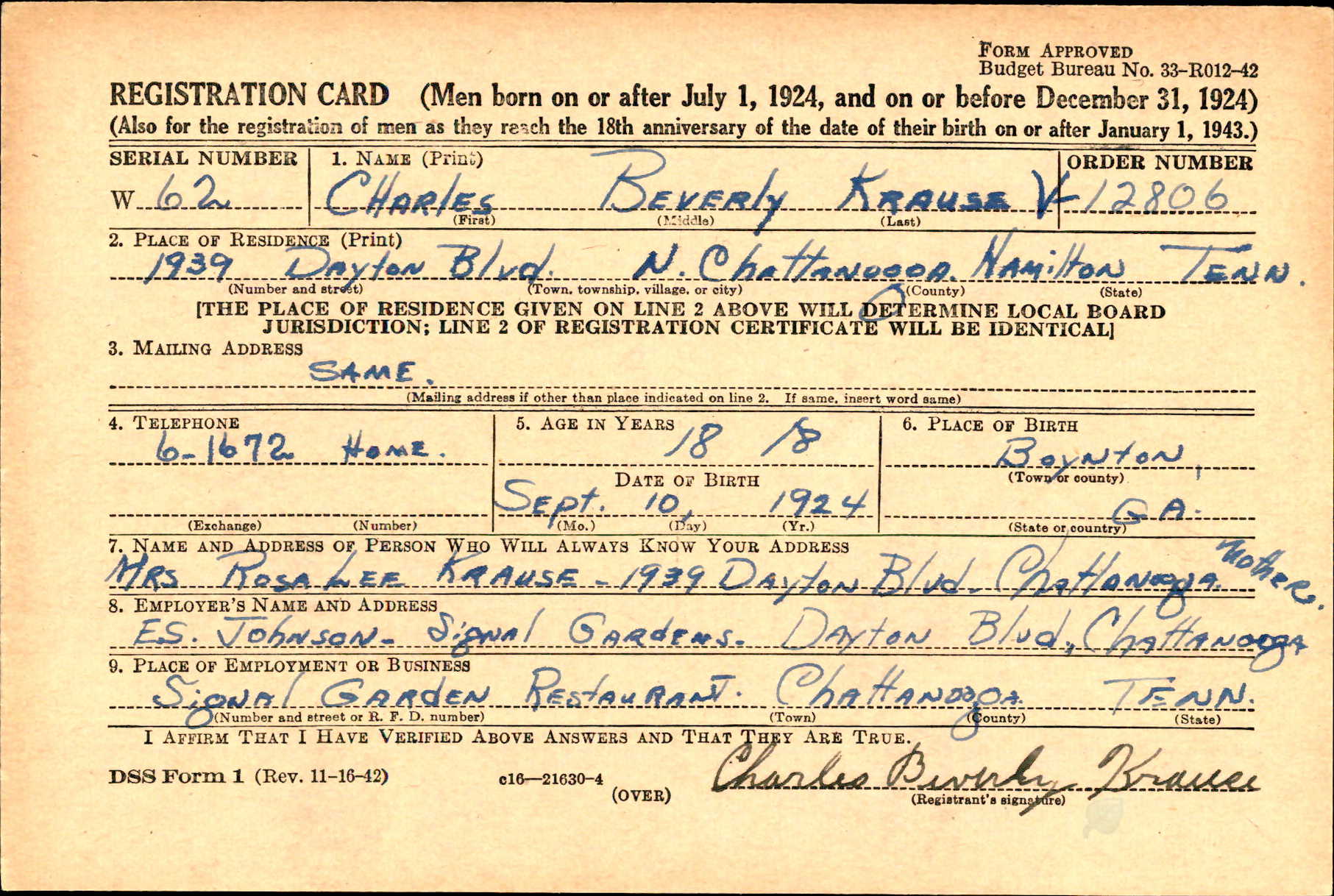 Charles Beverly Krause was born in Boynton, Georgia, the son of Charles Theodore Krause and Rosalee “Rosie” Battson.