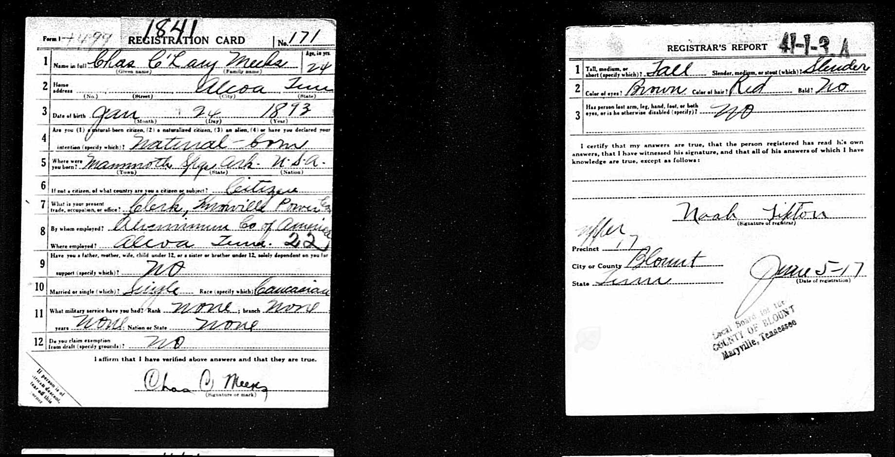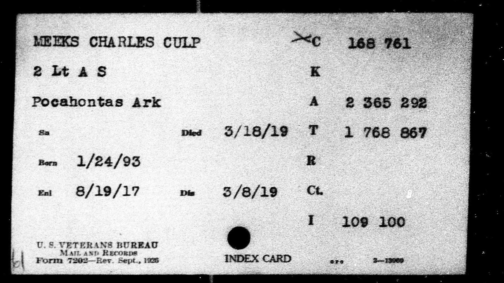 Charles Clary (or Culp) Meeks was born on January 24, 1893 in Mammoth Springs, Arkansas. He was the son of John Wilson Meeks and Mary D. Tucker Meeks. He was the brother of Arkie A. Meeks and Mary Elizabeth Meeks. Prior to joining the military, he was employed as a clerk for the Knoxville Power Company at the Aluminum Company of America in Alcoa.